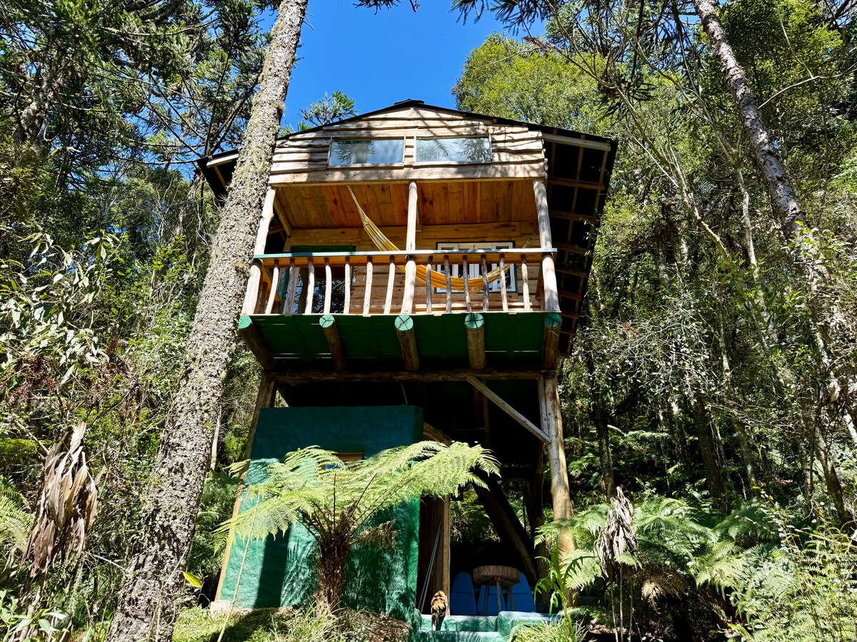 Cabana alta em meio à floresta, com total privacidade. O mezanino abriga um quarto aconchegante; abaixo, cozinha aberta, fogão a lenha, banheiro e chuveiro integrados à natureza. O entorno oferece rio, trilhas e contato direto com o verde, ao lado do Parque Nacional de São Joaquim — um refúgio perfeito para quem busca tranquilidade e conexão natural.