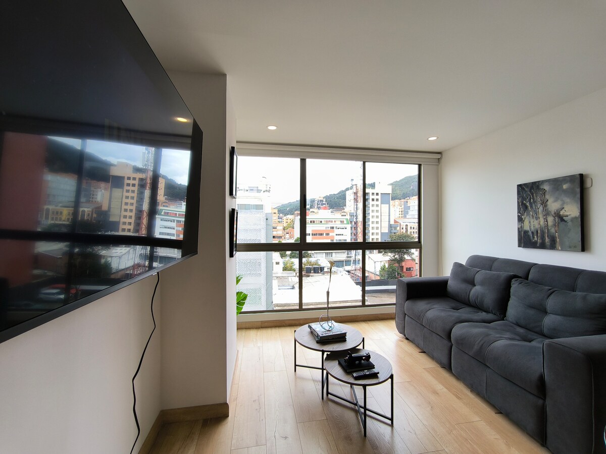 Hermoso apartamento en Santa Bárbara Nororiental, tiene un dormitorio de cama doble, tv, closet y baño. Sala con baño auxiliar, cocina completamente dotada/ barra/comedor. El edificio tiene una terraza donde se puede disfrutar de una vista maravillosa a los cerros orientales y abajo cuenta con un cuarto de ropas. Es un espacio ideal para pasar una temporada en Bogotá,cerca a un barrio típico donde hay restaurantes de alto gourmet, Clínicas y hospitales reconocidos y a dos famosos mall shopping
