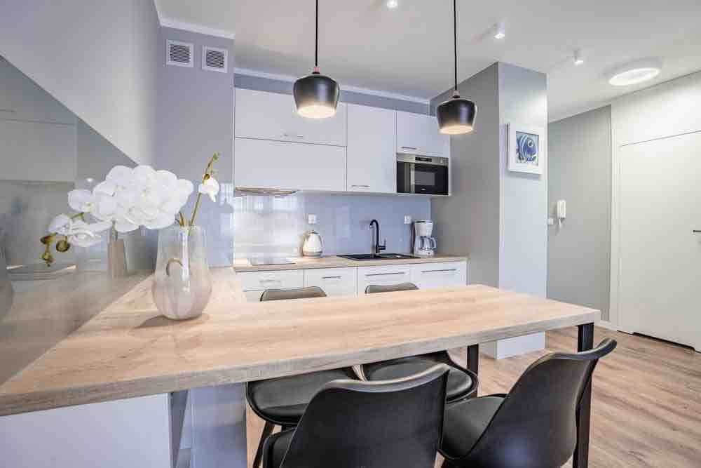 Apartament jest przestronny, urządzony w jasnych, przytulnych tonach, nawiązujących do nadmorskiego klimatu. Na gości czeka dobrze wyposażony aneks kuchenny, idealny do przygotowywania posiłków, strefa wypoczynkowa oraz balkon, na którym można wypić poranną kawę, podziwiając okolicę. Dodatkowo w obiekcie dostępne są udogodnienia, takie jak miejsce parkingowe i bezpłatne Wi-Fi, które sprawiają, że pobyt jest wygodny zarówno dla rodzin z dziećmi, jak i par szukających romantycznego wypoczynku.