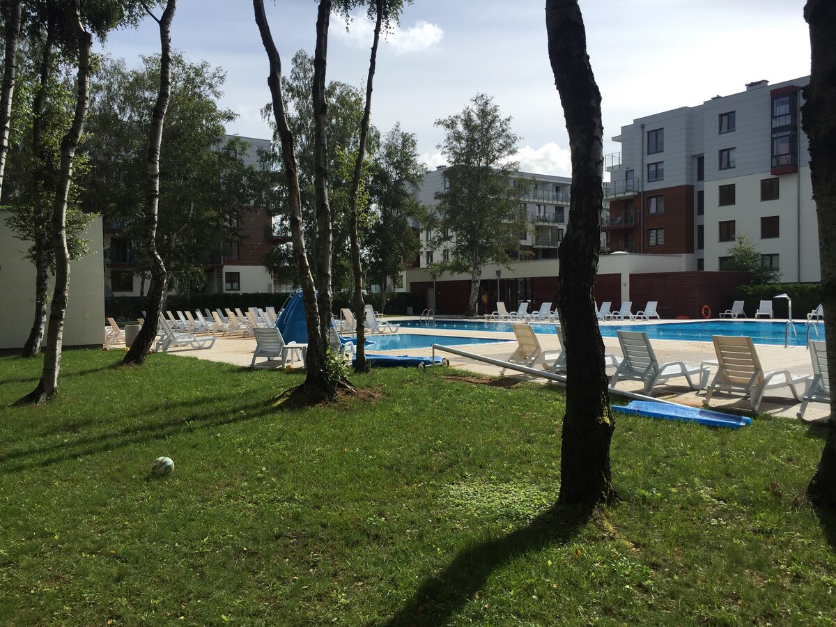 Apartament z balkonem i prywatną sauną na zamkniętym nowym osiedlu niedaleko piaszczystej plaży i centrum. Nowoczesny i przytulny design. Apartament posiada pralkę, zmywarkę, ekspres ciśnieniowy z młynkiem, żelazko. W salonie i sypialni znajdują się pojemne szafy. Do dyspozycji gości są: wygodne duże łóżko oraz komfortowa rozkładana sofa. W budynku jest winda. Dodatkowe prywatne miejsce postojowe znajduje się obok nieruchomości. Aranżacja apartamentu sprawi, że wypoczynek będzie niezwykle udany!