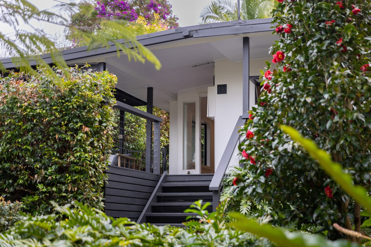 quick stop-over to refresh and relax en route, or, enjoy a longer holiday easy to find - 200m off Highway but no noise!! vaulted ceilings awesome location - great views - peaceful and private 1 x queen bed; 2 x king single beds; 4 guests max - fully furnished architect designed, spacious, spa bathroom, modern kitchen, tv, video 5 grassy acres surrounded by bush; horses to feed; swings trampoline; children's indoor games & toys ; undercover bbq; huge undercover screened deck; self-cater