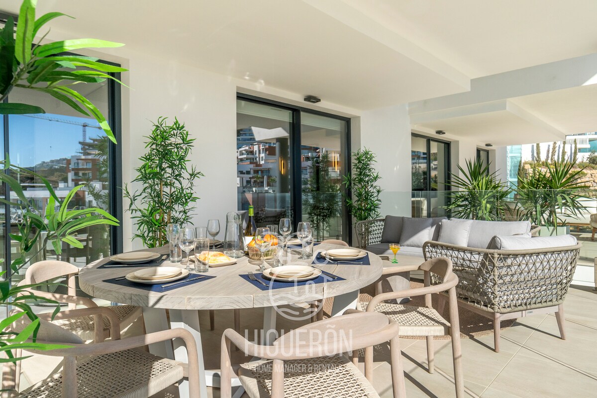 Exclusivo apartamento de 2 dormitorios y 2 baños en MED TWO Collection, Higuerón West. Amplio y luminoso, con terraza sur espectacular, BBQ, chill-out y comedor exterior, ideal para familias, parejas o amigos. Cocina moderna y salón abierto con Smart TV y WiFi. Piscina comunitaria abierta todo el año, 2 plazas de parking privadas y jardines. A solo 100 m de la playa, cerca de Playa de Carvajal, centro de Fuengirola y Higuerón Spa & Beach Club (servicios con coste adicional).