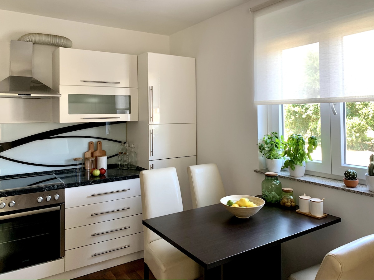 ★"...perfekte Wohnung für Familien mit allem, was man braucht." 57m2 Appartment im 1. Stock im Boho Style nur 30m zum Meer, ruhig gelegen und doch nahe zum Zentrum. ☞ Balkon (180° Blick) mit großem Tisch, Elektro Griller und Aussicht aufs Meer ☞ kostenloser Privatparkplatz direkt vorm Haus ☞ 50 Zoll Smart TV ☞ gratis Kaffee und Tee ☞ Voll ausgestattete Küche ☞ Wasch-Trockner ☞ bequeme Betten mit Memory Schaum Topper ☞ flexibler Self Checkin/Checkout
