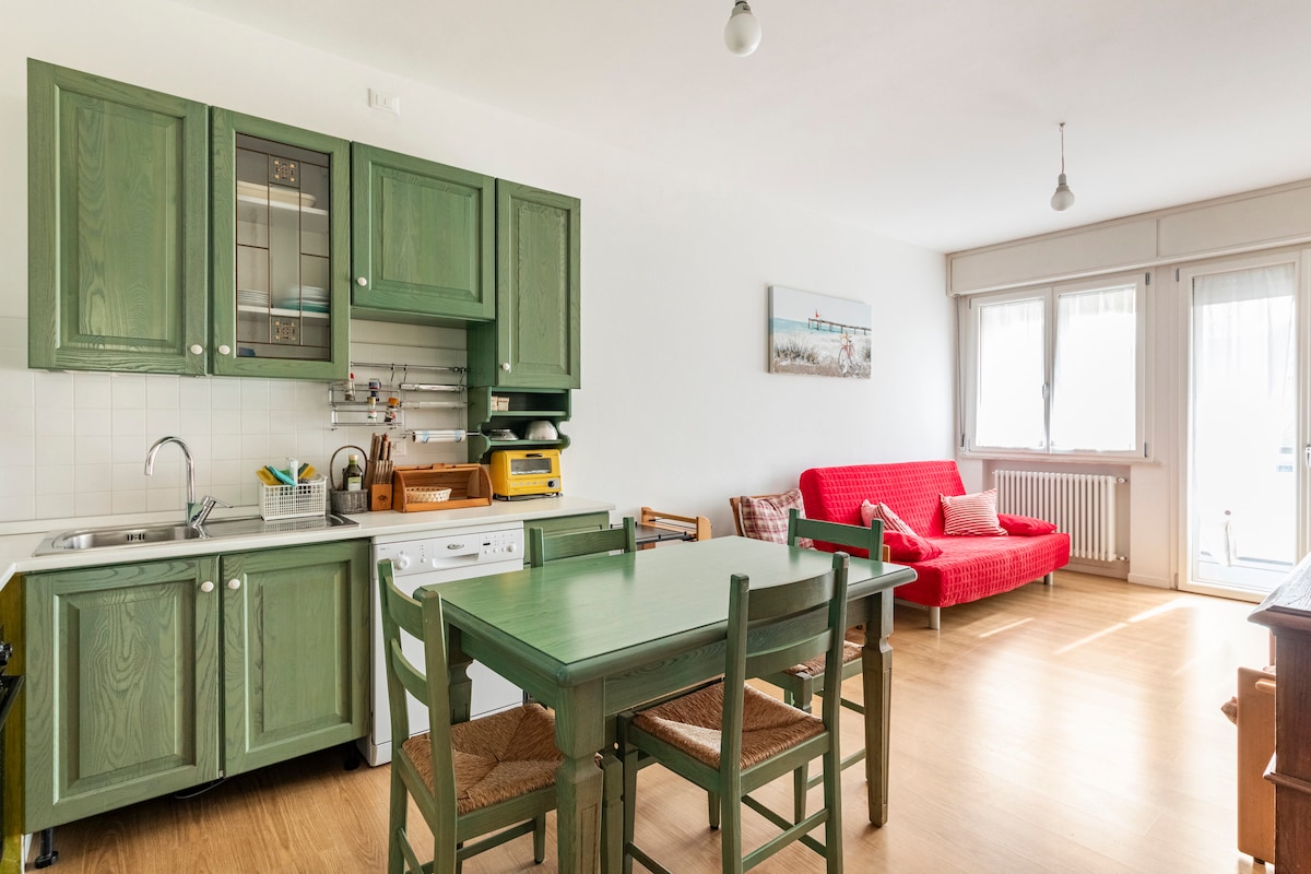 Intimo appartamento situato in zona strategica adiacente al centro di Cesenatico nel quartiere di "Boschetto", a 150 metri dal mare. L'alloggio offre due camere con 2 letti matrimoniali e uno singolo; cucina perfettamente fornita con frigorifero, forno, utensili vari, stoviglie, piano cottura e TV; un bagno completo con box doccia e lavatrice. Vi è una zona barbecue in comune. Ingresso privato e parcheggio gratuito all'interno della proprietà. Sono ammessi animali domestici.