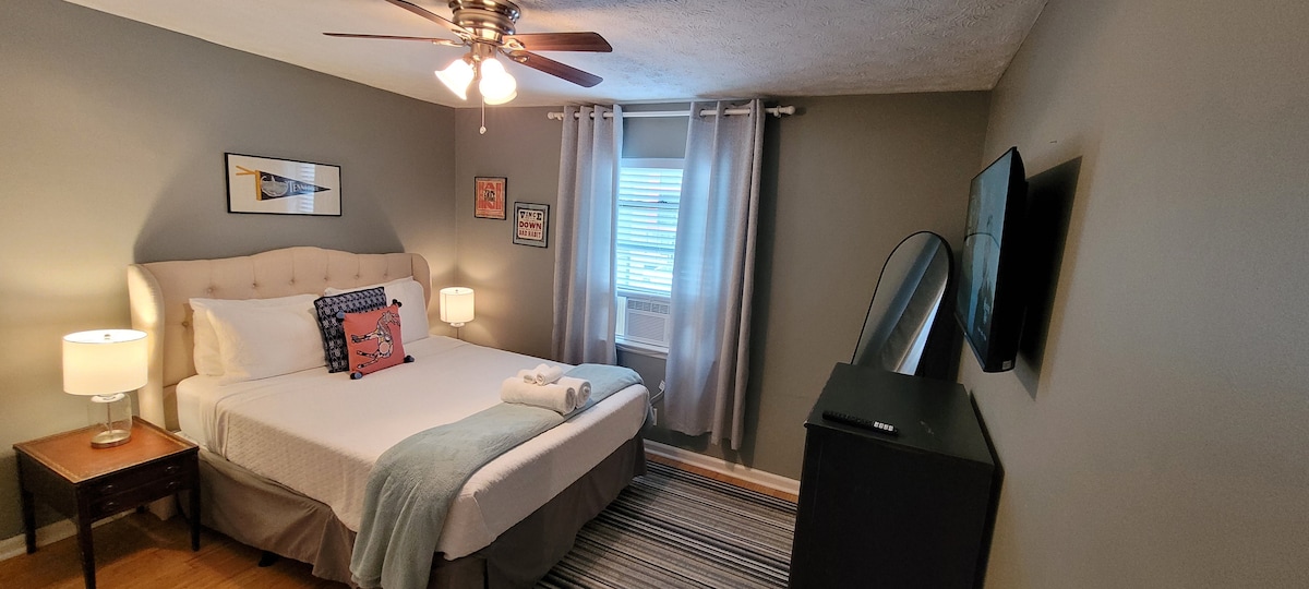 This professionally designed studio is minutes from Nashville’s top venues and just 2 miles from Broadway - perfect for concert nights and couples’ getaways. Guests often say this is one of the cleanest stays they’ve experienced, with thoughtful details that make it especially comfortable. Enjoy reserved parking, easy self check-in, a fully stocked coffee station, high-end finishes, a spacious walk-in shower, and a comfortable home base close to it all.