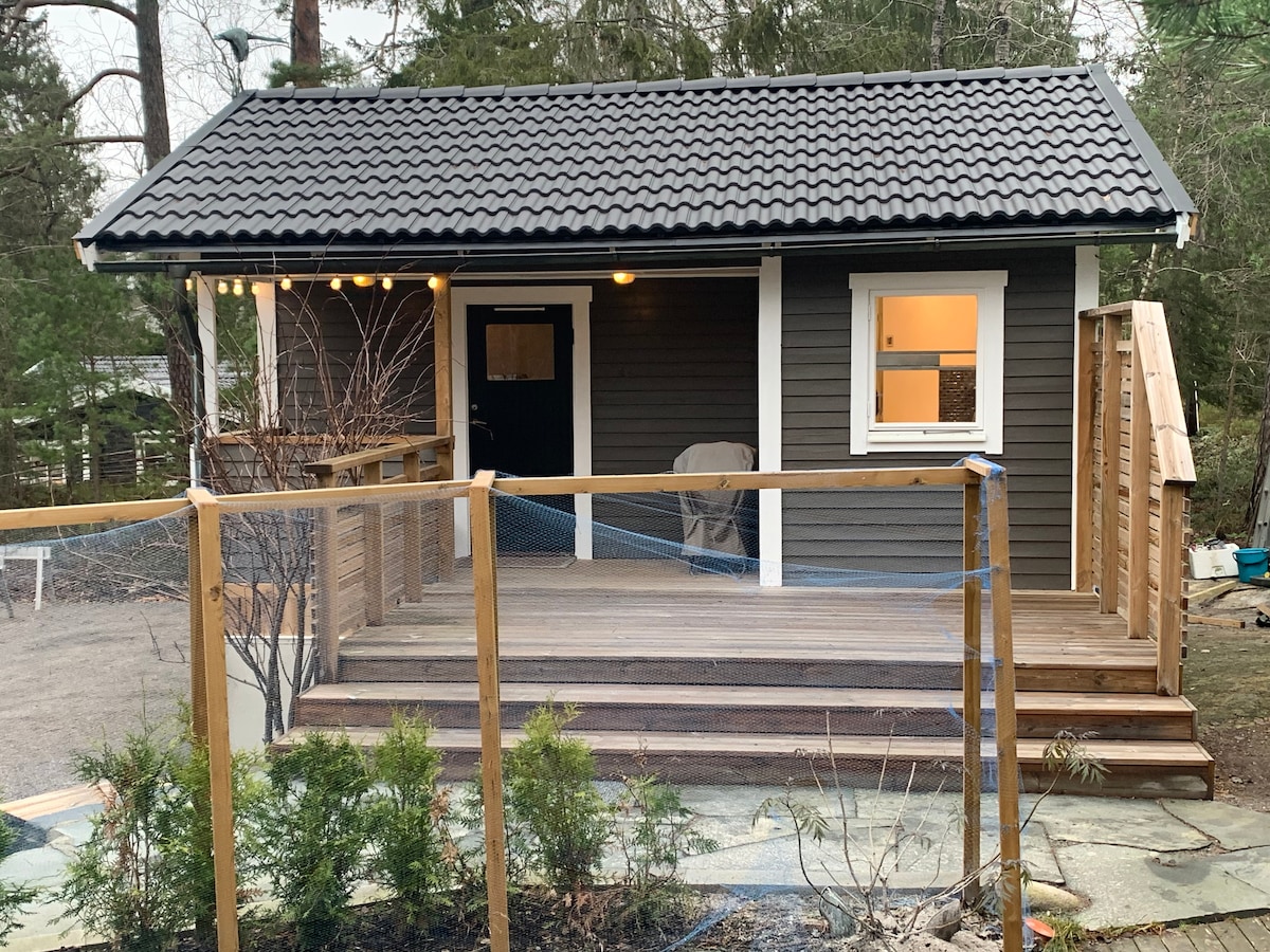 멋진 게스트하우스에 오신 것을 환영합니다! 건축가가 모던한 스타일로 새롭고 신선하게 디자인했습니다. 높은 천장은 야외 가구와 환상적인 휴식을 위해 만든 숯 그릴이 있는 대형 전용 나무 데크로 연결되는 이중 문이 있는 쾌적하고 빛나는 거실을 제공합니다. 편리한 거리에 도시가 있는 스톡홀름 군도에 있습니다. 필요한 모든 시설을 갖춘 신선한 주방, 아늑한 수면 로프트, 샤워 시설, 화장실, 세탁기가 있는 타일 욕실. 와이파이. 바다와 잉가뢰의 아름다운 18홀 골프 코스 두 곳까지 도보 거리.