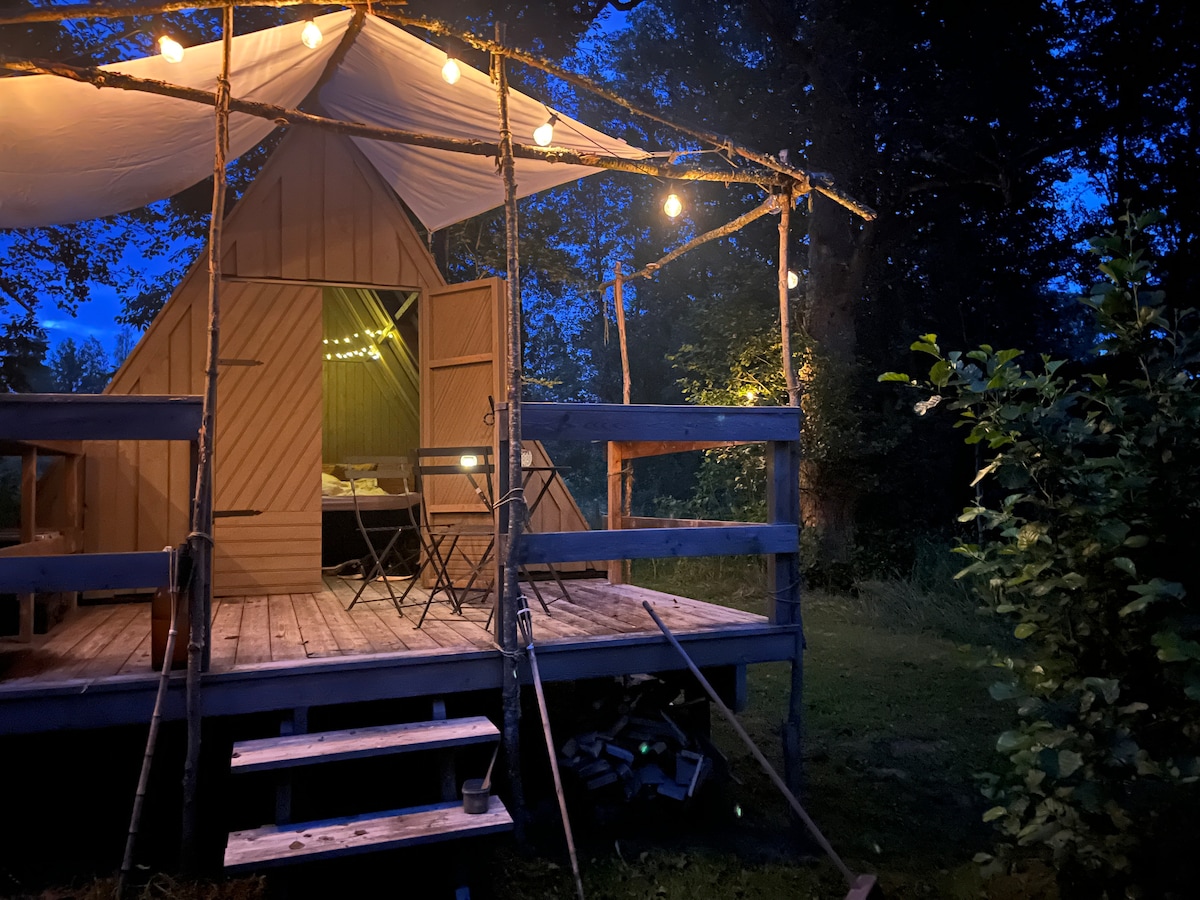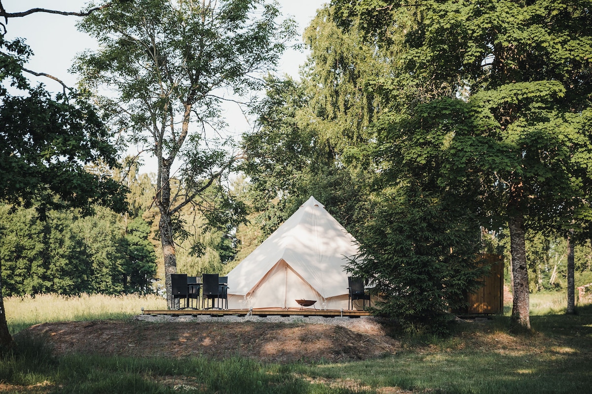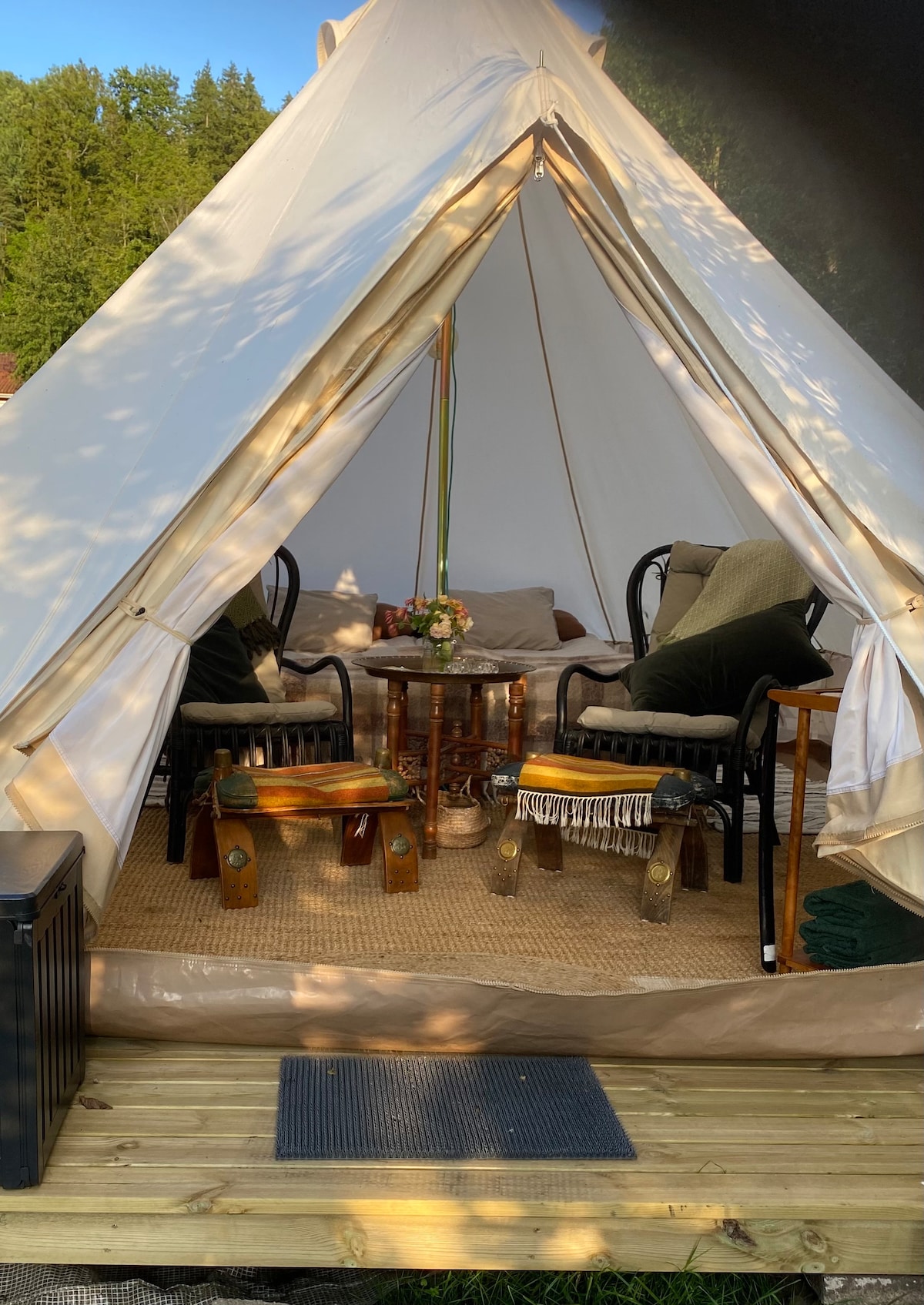 Njut av den härliga miljön på detta romantiska boende i naturen. Bo i ett lyxigt tält med nybäddade sängar och vakna upp utvilad till naturens fågelsång! Tältet hyrs ut per natt inklusive frukost. Du kan bo 1-5 st Tältet är utrustat 5 personer. En dubbelsäng är alltid bäddad. Här kan man sova 1-3 personer. En bäddsoffa kan med ett enkelt grepp dras ut till 2 sovplatser. Dessutom finns en luftmadrass att blåsa upp vid behov. Du sopar och diskar efter dig. Lakan, handdukar och slutstäd ingår.