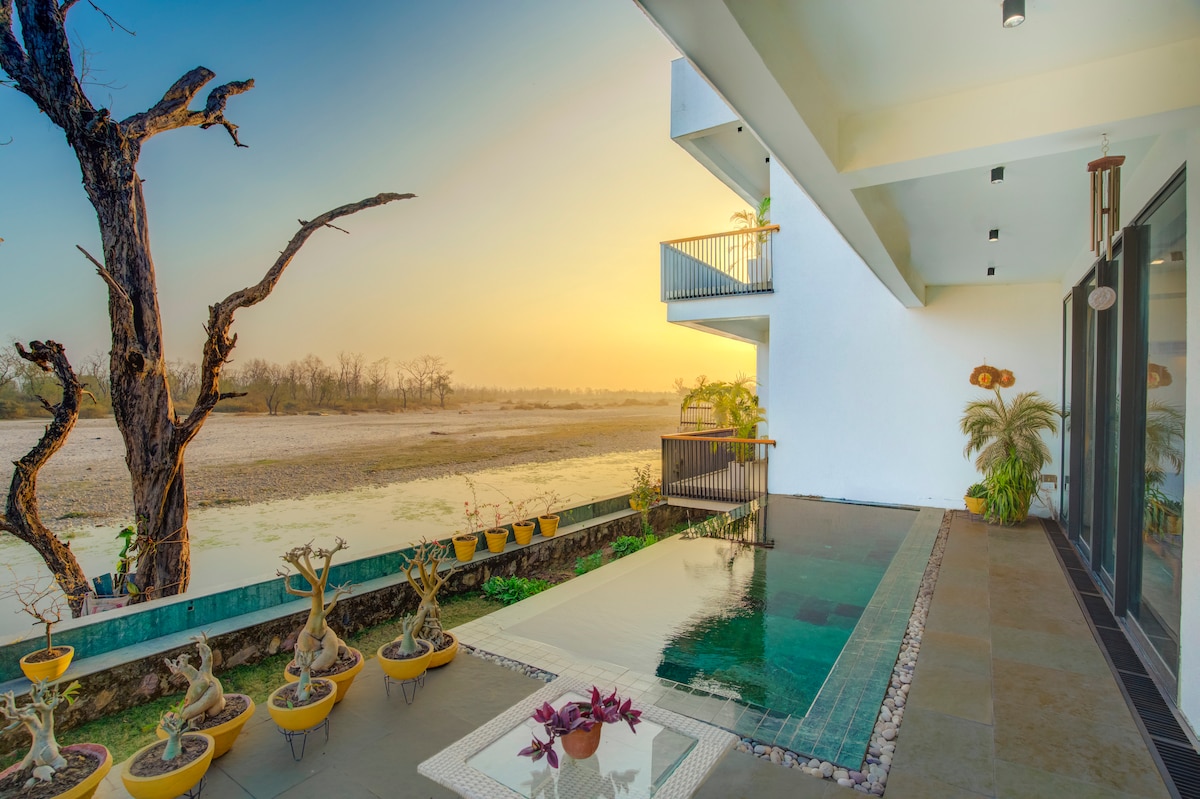 신성한 강가의 고요한 곳에 위치한 8100평방 피트의 넓은 숙소로 숨막히는 숲과 강 전망을 제공합니다. 각 방마다 전용 욕실이 있는 5개의 객실로 최대 10명의 게스트를 편안하게 수용할 수 있습니다. 거실에는 전용 수영장, 푸르른 정원, 65인치 소니 LED TV를 즐길 수 있습니다. 도시의 소음에서 벗어나 휴식을 취하고 긴장을 풀 수 있는 완벽한 장소입니다. 쿡은 숙박을 개선하기 위해 수요에 따라 이용할 수 있습니다. 특별한 휴양지에서 평온함, 고급스러움, 자연을 경험해보세요.