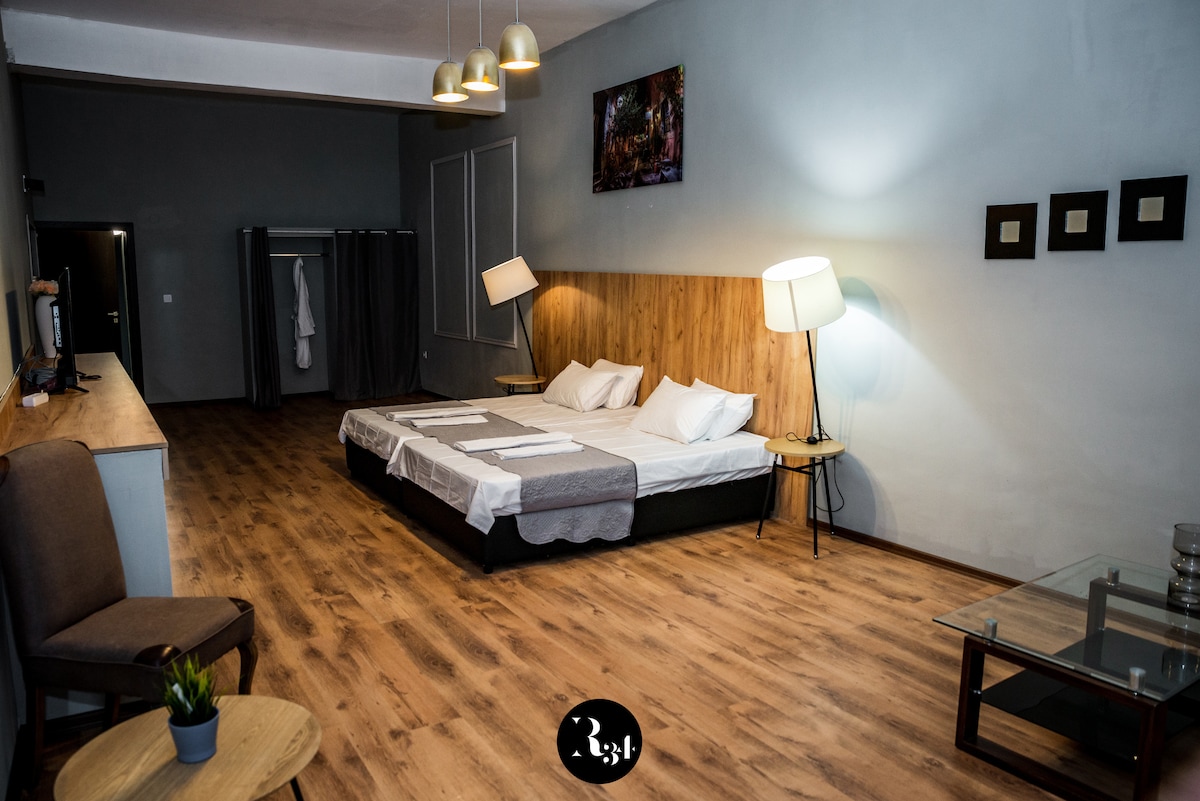 -2층에 위치한 유일한 방입니다. 더블 베드를 형성하기 위해 틈 없이 나란히 이동할 수 있는 2개의 싱글 베드가 구비되어 있습니다. 모든 침대 옆에는 테이블 램프가 설치된 침대 스탠드, 거울이 설치된 드레싱 테이블, 옷장이 있습니다. 모든 것이 흰색으로 되어 있습니다. 앤틱한 스타일은 유지하지만 모던한 감각을 살렸습니다. 이 객실은 얀트라 강, 아센 왕조의 불가리아 규칙 기념비, 구르코 거리의 건축 명소를 조망할 수 있습니다.