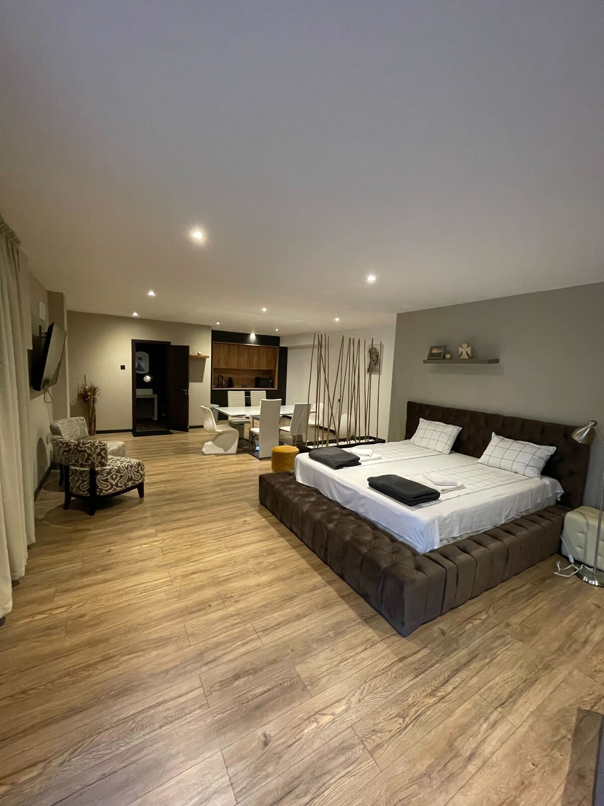 이 객실에는 큰 더블 침대, 테이블 램프가 있는 침대 협탁 2개, 세련된 거울이 있는 서랍장이 있습니다. 모든 가구는 아이보리 컬러이며 독특하고 타의 추종을 불허하는 부티크 스타일입니다. 객실에는 2명을 수용할 수 있도록 펼칠 수 있는 리클라이너 의자도 마련되어 있습니다. 커튼 뒤에는 구르코 거리의 전망을 감상할 수 있는 넓은 창문. 고급 욕실, 케이블 TV가 구비된 TV, 미니 냉장고, 에어컨, 헤어드라이어, 무료 와이파이가 갖춰져 있습니다.