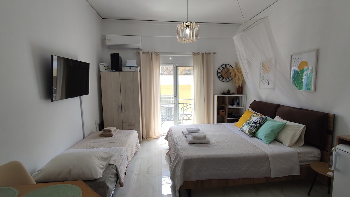 A apartment including 2 bedrooms, a bathroom, and a big living room with a kitchen and a very comftable balcony and courtyard. There is also a free parking. Our house is 10 minutes away from the airoport, 2 minutes away to the supermarket and to the bakery . A 5 minutes walk to Pizza Fun and to Traditional Greek food souvlaki.