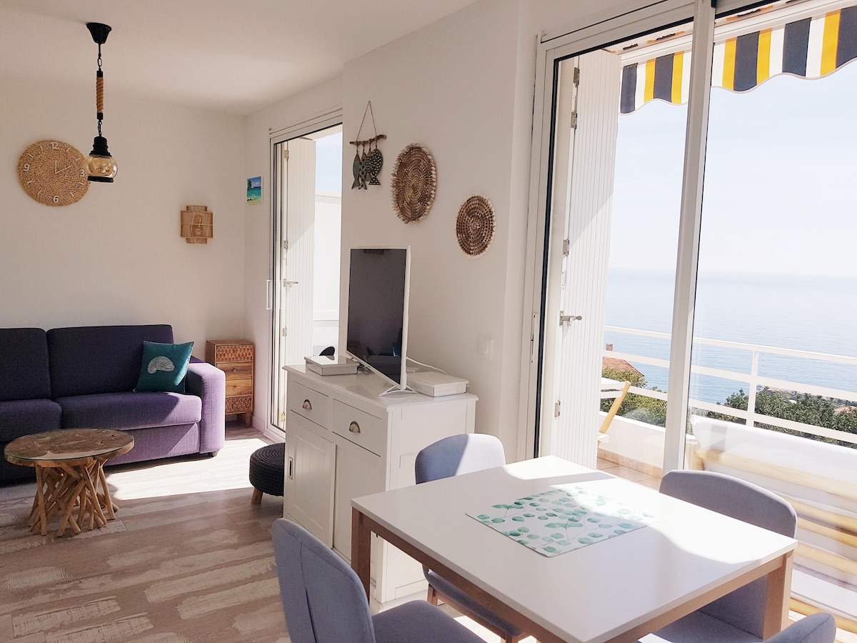 아름다운 2인실 (31m2) 엘리베이터 없는 1층 및 최상층, 에어컨, 밝은 채광, 남쪽 바다 전망, 레랭 제도의 파노라마 전망. 레지던스 바로 앞에 전용 주차장이 있습니다. 테라스 12m2. 와이파이가 설치된 침실과 거실에 스마트 TV가 있습니다. 거실에 개방된 주방. 전자레인지, 오븐, 냉장고(냉동고 포함), 인덕션, 식기세척기, 주전자, 커피 메이커, 네스프레소 및 토스터. 샤워기, 변기, 세탁기, 헤어드라이어가 있는 욕실.
