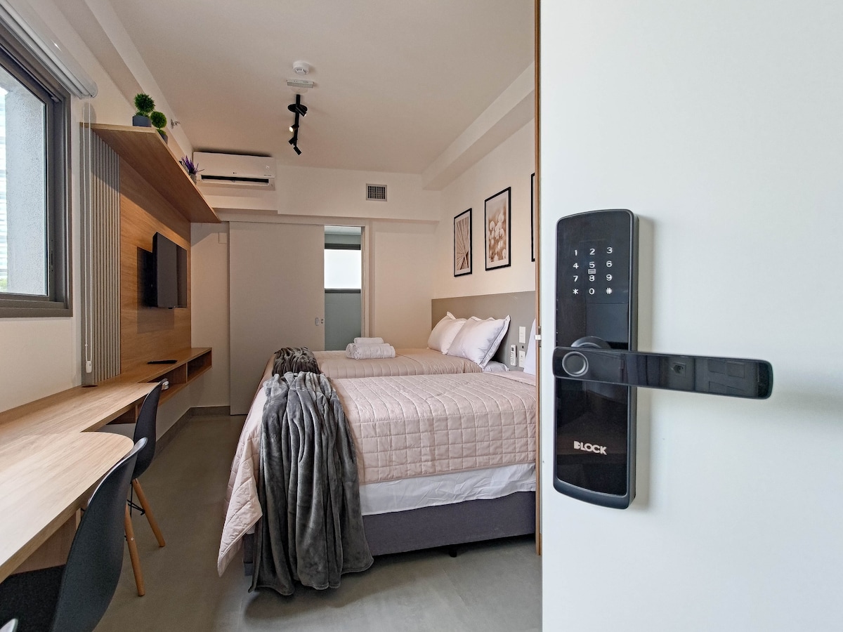 슈퍼 럭스 익스클루시브 1 베드룸, 26 층 마지막, 무료 주차장, 조리 도구 및 가전 제품, 현대적인 인테리어 및 디자인, 휴식 및 작업 기간 동안 훌륭한 공간, 프레이 카넥라 쇼핑몰 앞, 아비냐 가까이. 파울리스타 역, 트리아논역, 콘솔라칭역, 시리오 리바네스 병원 9 주 레퍼런스, 클럽 인프라, 지하철 근처, 벨라 비스타 최고의 위치에 있습니다.