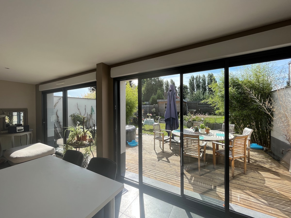 Belle maison individuelle familiale contemporaine, très claire. Ambiance empreinte de sérénité. L'impression d'être dehors. Joli jardin exposé S/O sans vis à vis. Equipement complet. Idéale aussi bien pour des réunions de travail qu 'avec des enfants Bien située pour faire une halte au calme dans la région lilloise, organiser une réunion de travail, se retrouver en famille ou entre amis, visiter ses proches. Vous êtes accueillis dans une maison familiale Draps, éponges et lits faits sont compris