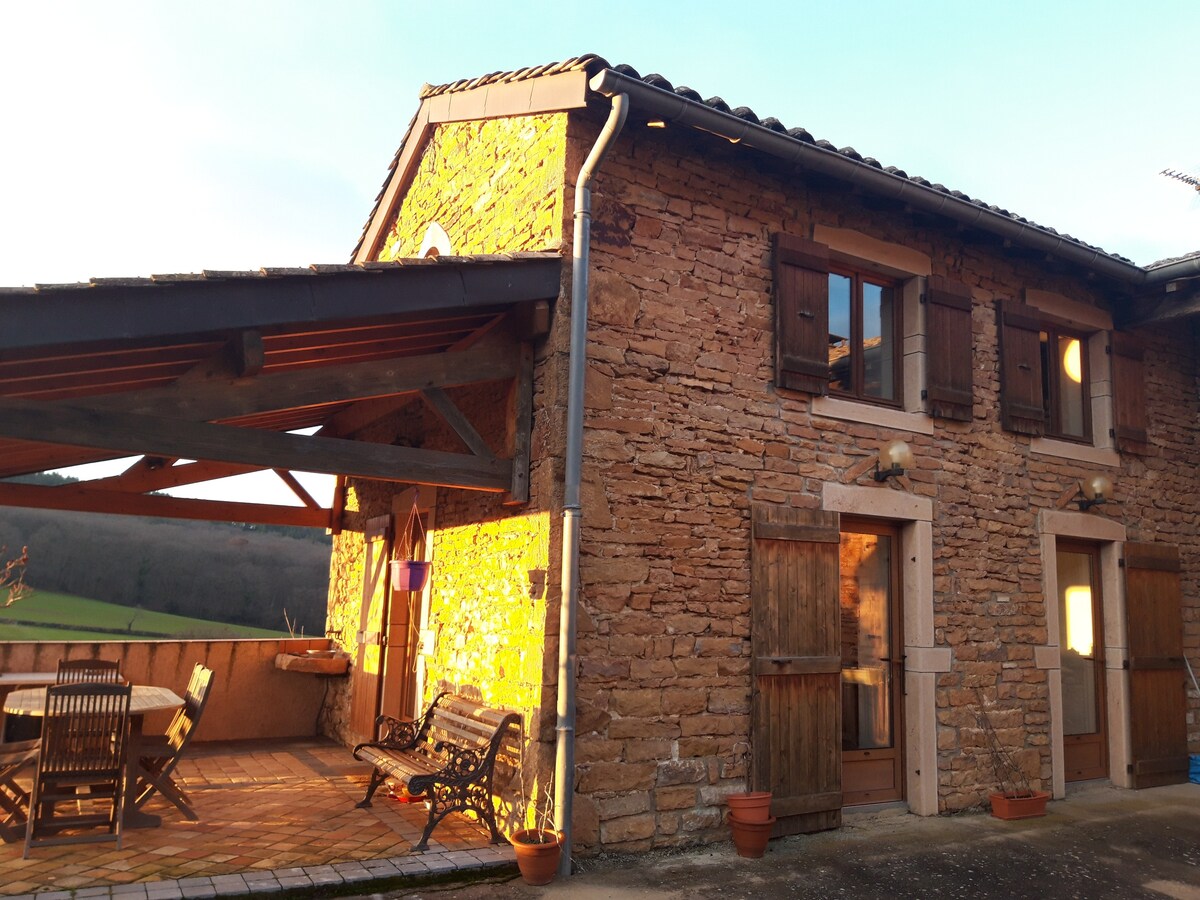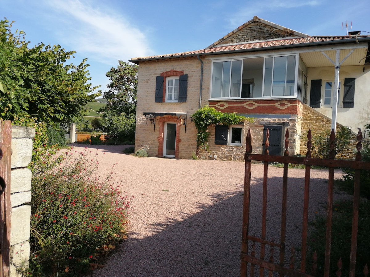 따뜻하고 조용한 전원주택. 자연을 한눈에 볼 수 있는 탁 트인 전망을 즐기며 녹지에서의 숙박을 즐기세요. 2층에 더블 침대가 있는 침실 2개, 더블 컨버터블 침대 1개, 중이층에 싱글 침대 2개를 마음껏 이용하실 수 있습니다. 숙소에서 바로 하이킹 코스에 접근할 수 있습니다. 보졸레 지역과 가까운 곳에서 휴식을 취하고 즐기세요.