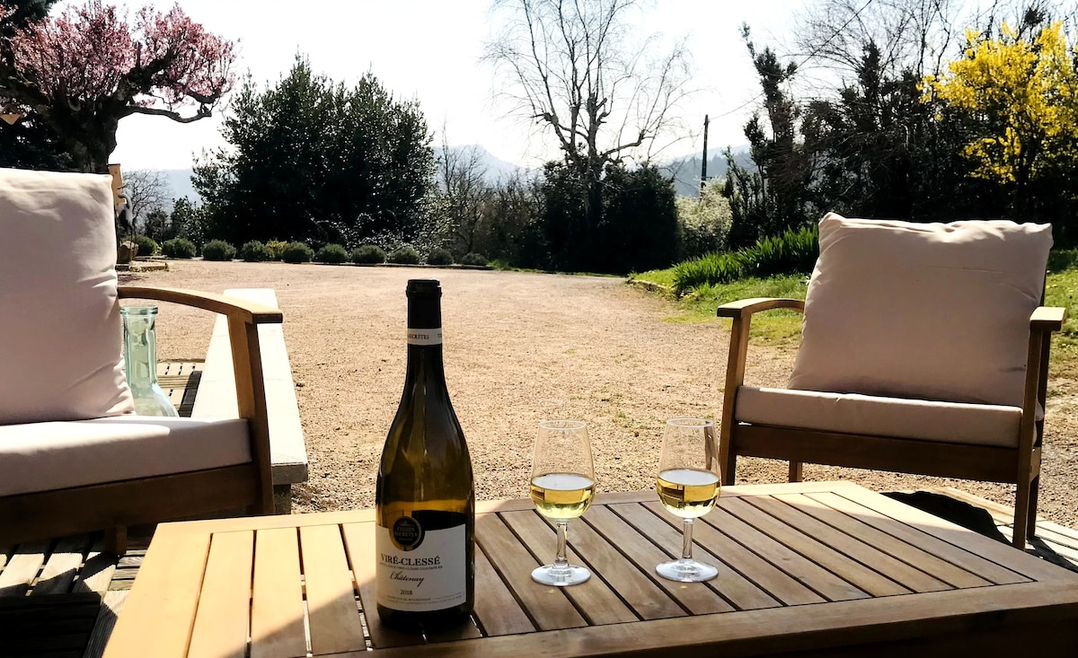 Gîte indépendant avec terrasse dans une villa familiale, environnement nature ! Sur les sentiers au départ du gîte, superbes panoramas sur les monts et les vignobles du Mâconnais ; si vous le souhaitez, poursuivez votre randonnée jusqu'aux châteaux de Berzé et de Pierreclos. Découvrez l'histoire des moines du Moyen Âge à l'abbaye de Cluny, grimpez en haut de la roche de Solutré, dégustez les vins de Bourgogne et rafraîchissez-vous aux lacs de Saint-Point et de Cormoranche.