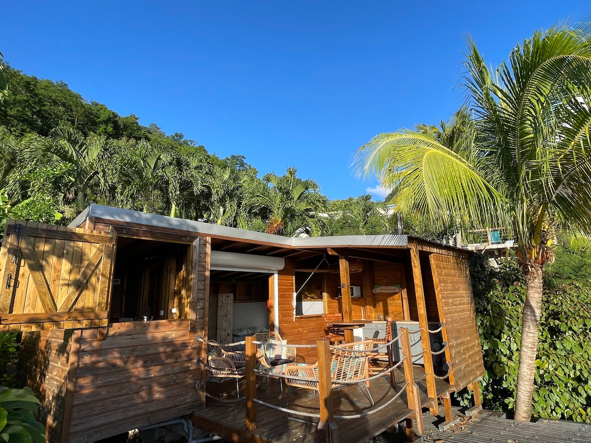 Vivez une expérience unique ! immergée dans un jardin tropical, bingalow vue imprenable sur la mer et la réserve Cousteau. Accessible par un chemin très pentu sur 100m, vous ne pourrez y accéder qu'à pied ou en 4x4 mais je monte vos valises et vos courses. Energie solaire et captage de rivière. Vous serez seuls à profiter de ce magnifique endroit. Venez vivre un moment en harmonie avec la nature et les éléments ! 10 minutes à pied de la mer, 20 de la plage. Cabane avec tout le confort