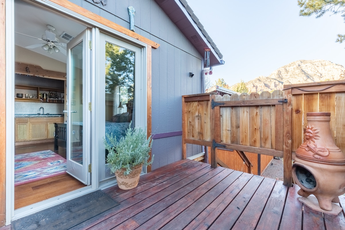 This is your romantic get-a-way! Drive through the majestic red rocks to find your casita hidden behind a private gate on an acre of property with pine trees, gardens and the owners rustic log home. Enjoy a spa like experience with wine, robes and continental breakfast. Outdoor patio to soak up the sun and enjoy your coffee in the morning or gaze at the star lit skies at night. Walking distance to the famous Oak Creek at the base of Cathedral Rock with hiking and biking trails galore.