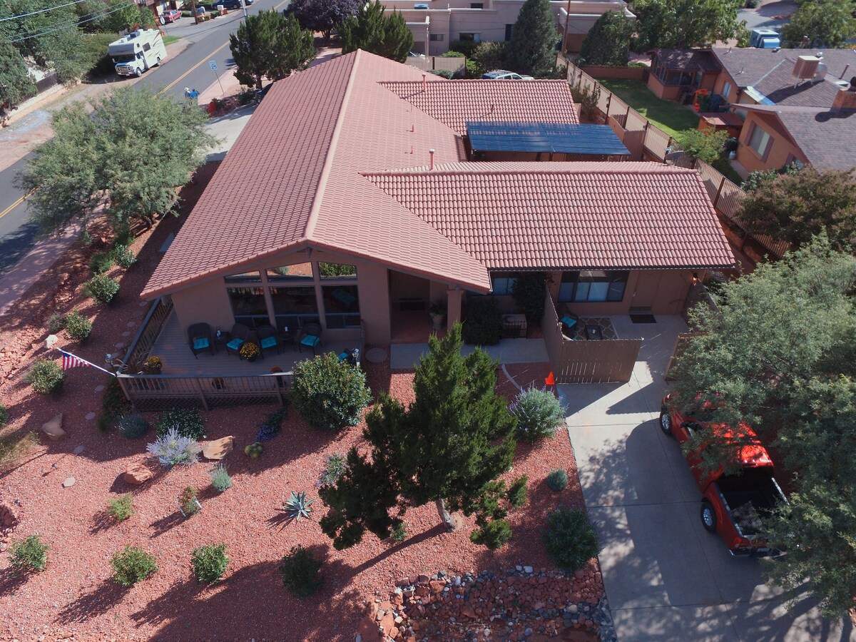 Experience the Chapel Vortex! Custom designed masterpiece offers soaring ceilings & huge glass windows that showcase spiritual Red Rock mountains of Sedona. Newly remodeled, the 3BD/3BA get-away features a dramatic living room, chef’s kitchen, dining room, office, two romantic master suites. One opens to a beautifully landscaped back yard with turf, hot tub, BBQ & relaxing fountain/pond. Circular stairway leads to private loft suite & large star gazing deck. Hiking is right out the front door!