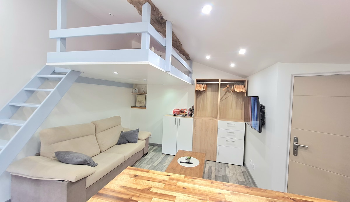 Studio d'environ 30 m2 composé d'une petite cuisine, d'un canapé lit, d'un dressing, d'une mezzanine avec un lit 2 places. Le logement peut accueillir jusqu'à 4 personnes. La Salle de bain est équipée d'une douche, WC, lavabo, seche serviette. Les draps et serviettes sont fournis. L'accès s'effectue en passant par le garage de la maison puis vous avez votre espace privatif. Remise des clefs en mains propres entre 18 et 21h.