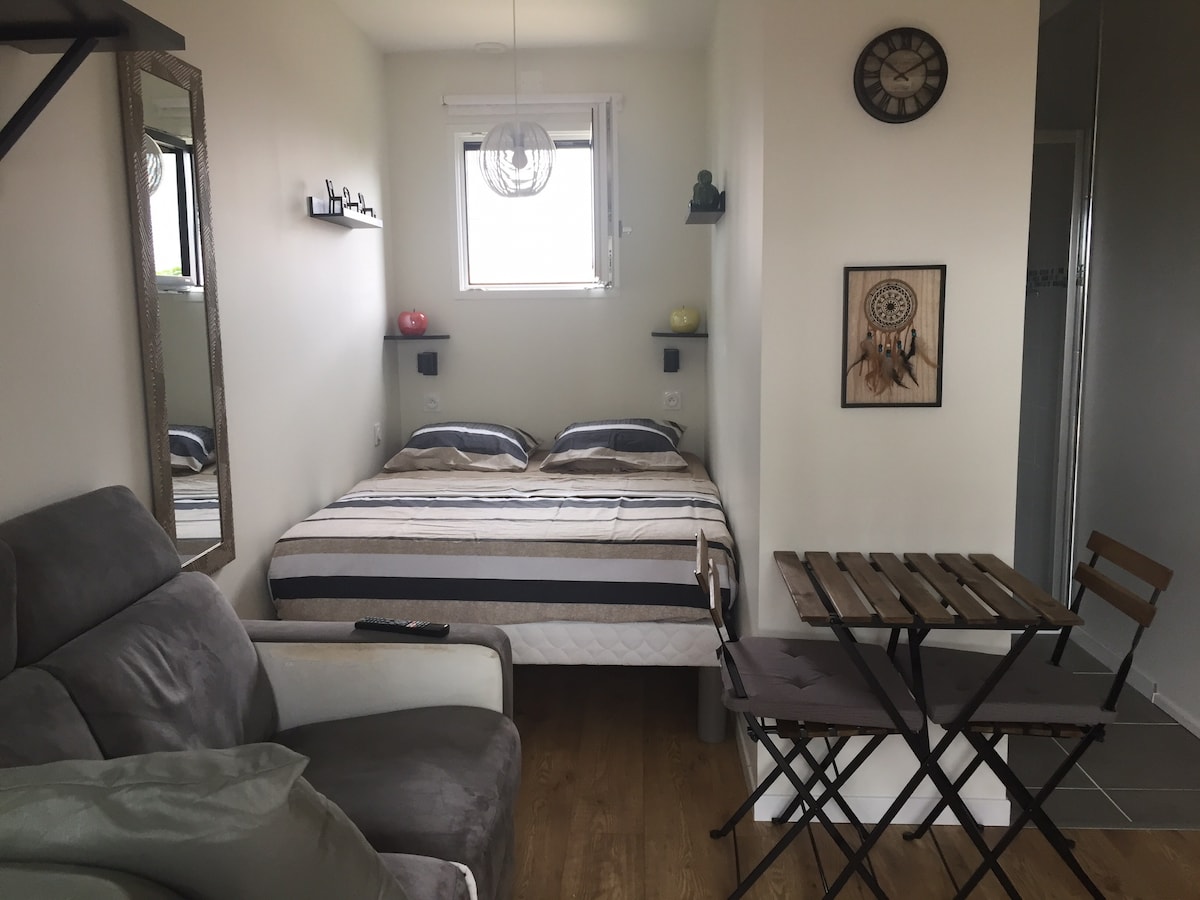 완벽합니다! 이제 에어비앤비와 같은 플랫폼에 최적화된 영어 버전이 있습니다. --- 모든 편의시설에서 도보로 가까운 거리에 있는 이 평화로운 작은 집에서 편안하게 지내세요. 보르도에서 차로 5분, 대중교통으로 2분 거리에 있습니다. 조용한 동네에 위치한 숙소에는 다음이 포함됩니다. 침실 1 퀸사이즈 침대(160cm)가 있는 메자닌 1개 소파베드 1개 2~4인에게 이상적이며, 최대 6명까지 수용할 수 있습니다. 전용 정원 — 휴식을 취하기에 안성맞춤입니다.