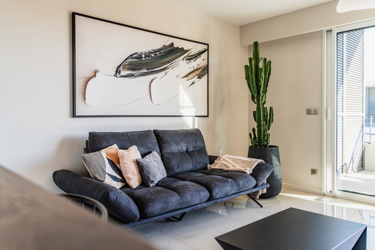 후안레팽 중심부에 위치한 '아주리 후안레팽'은 모래 해변에서 도보로 2분 거리에 있으며, 지하 주차장이 있는 4인용 숙소입니다. 새롭게 리모델링한 시설이 완비된 아파트(세탁기 및 건조기, 식기 세척기, 커피 머신, 전자레인지, 리버서블 AC)입니다. 오른쪽에 아름다운 테라스 바다 전망이 있습니다. 조용합니다. 아름다운 아파트에는 광섬유 인터넷이 있는 책상 코너가 있습니다. 방 2개 (침실 1개, 컨버터블 코치가 있는 거실 1개), 54 ㎡. 공항 교통편 가능!