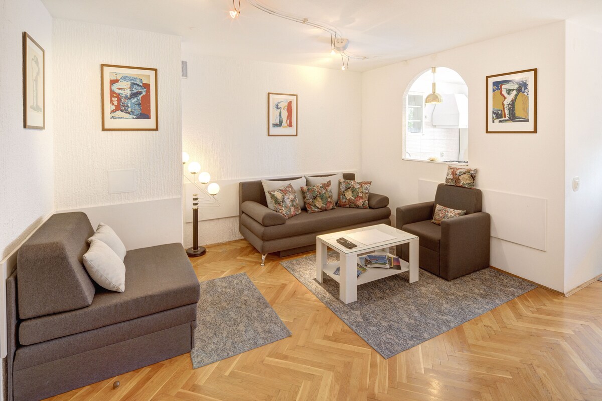 Apartmani imaju ulazne predprostore s velikim zrcalima, otvorene prostore u kojima su blagovaonica, kuhinja i dnevni boravak u jednom, odvojene spavaće sobe te kupaonice sa tuš kabinom. Namijenjeni su svima koji žele odsjesti u prostranom, moderno dizajniranom prostoru s daškom retro glamura i svim sadržajima potrebnim za komforan boravak. Naši apartmani napravljeni su s težnjom da se gosti u njima osjećaju opušteno i ugodno i da u njima pronađu mir.