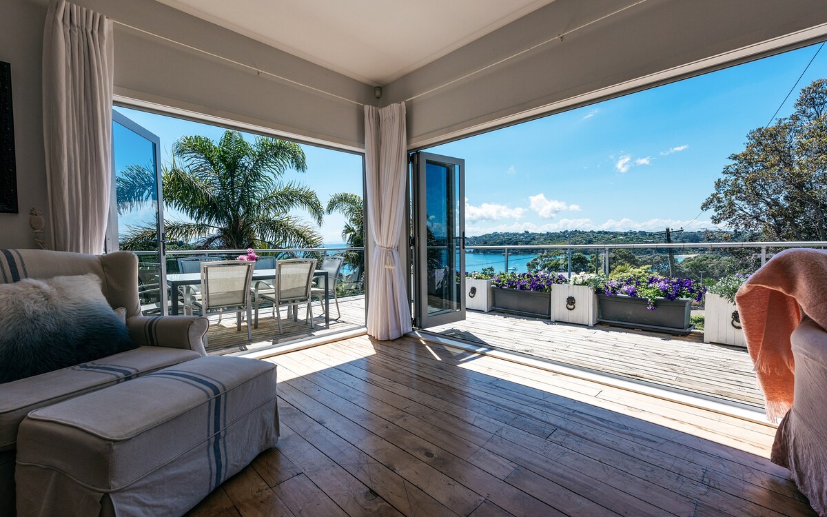 Get away from it all at this quiet, private haven off the beaten track. Watch the tuis in the Pohutukawa tree and take in panoramic sea views without leaving your duvet. Perfect for couples. It's a good climb up from the road but the views make it worthwhile. It’s a 10 minute walk down to Rocky Bay beach and Whakanewha forest reserve is right on the doorstep. Buses go to Rocky Bay but a car is recommended for further island excursions