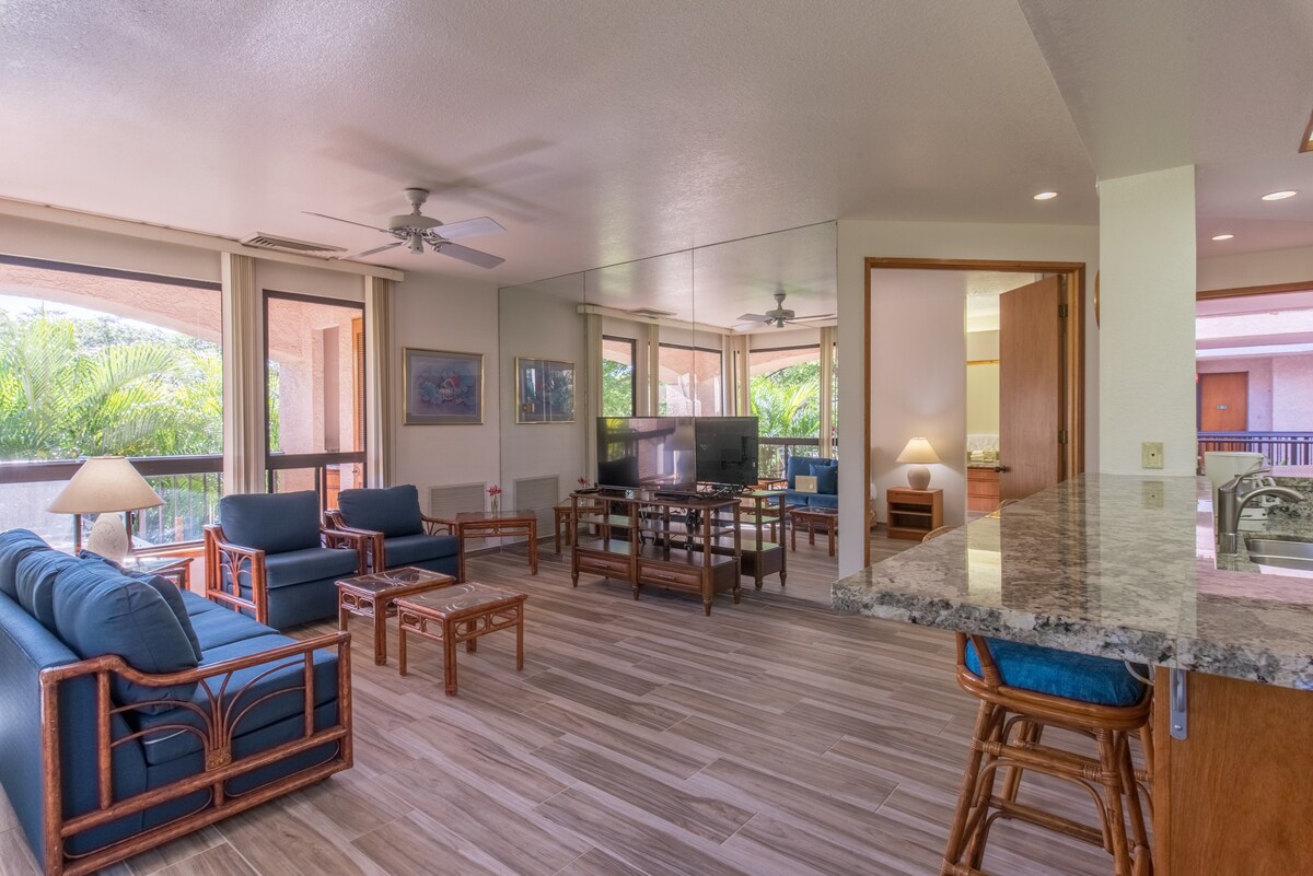 E Komo Mai-아름답게 꾸며진 페어웨이 빌라 2층 콘도에 계단이나 엘리베이터로 접근할 수 있습니다. 하와이에 오신 것을 환영합니다. 에어컨을 즐기거나 하와이 바람을 맞이하기 위해 창문을 열어두세요. 북쪽을 향하는 완벽한 그림 같은 베란다는 언제나 그늘이 있습니다. 침실 2개/욕실 2개인 콘도로 4명이 개인적으로 잘 수 있습니다. 넓은 거실, 식사 공간, 필요한 모든 편의시설이 갖춰진 주방이 있습니다. 숙소는 1,172평방피트로 지정된 주차 공간이 있습니다.