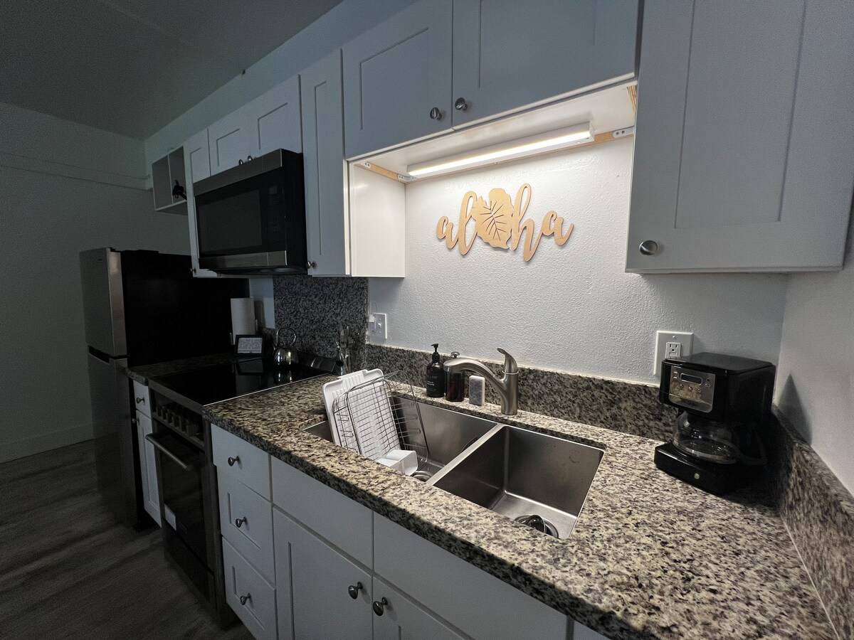 Enjoy a slice of paradise at our well appointed contemporary Hawaiian Hale - Kailani Studio Condo. Tropical greenery and plumeria add a sense of tranquility to the interior decor. Newly renovated with a draping canopy bed, brand new kitchen appliances and spotless bathroom.