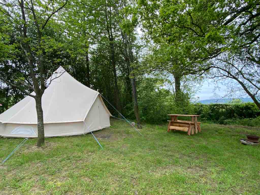 Cosy bell tent with king bed, fire pit, and stunning countryside views at Sychpwll. Our 5m bell tent is set in a private camping spot. Inside is a super-comfy king bed, carpets, and two chairs for a relaxing stay. Outside, enjoy a BBQ and fire area with a picnic bench. Guests also have access to a communal kitchen and toilet & shower block with warm showers in the straw-bale building complex. Sychpwll also has direct access to the river.