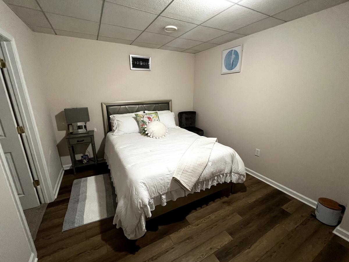 조용하고 평화로우며 넓고 깨끗한 공간에서 휴식을 취하세요. 5마일 이내에 즐길 거리가 많은 방문객 친화적인 커뮤니티 조용하고 훌륭한 구역에 위치한 넓고 편안한 지하실로 조명이 가득하며 전용 출입구가 있습니다. 침실 1개, 욕실 1개, 거실, 식사 공간, 주방, 요청 시 에어 매트리스가 포함됩니다. 또한 나무가 있는 넓은 뒤뜰을 이용하실 수 있으며, 왼쪽에 주차 공간이 1개 있습니다.