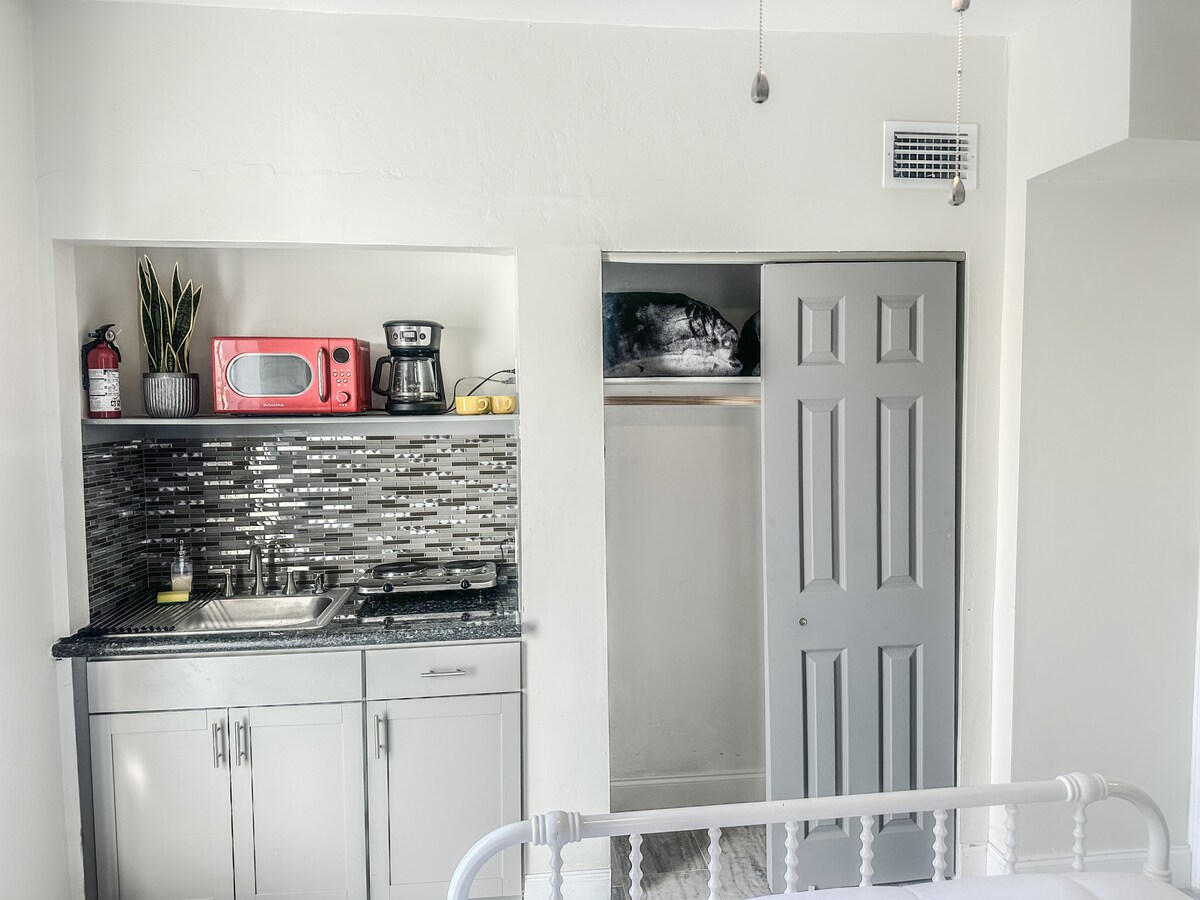 조기 체크인 가능 숙소 독특하면서도 평화로운 이곳에서 편안한 휴식을 즐기세요. 이 5성급 대성당 천장 코지 코티지는 새로운 퀸사이즈 침대와 전용 열쇠 없는 전용 출입구가 있는 1층 스튜디오입니다. 간이 주방에는 접시, 컵, 유리잔, 에어프라이어, 에어프라이어, 전자레인지, 전자레인지, 냉장고 등 기본 물품이 구비되어 있습니다. 휴식을 취하고 멋진 커피 한 잔이나 얼음 차가운 음료를 즐길 수 있는 야외 파티오가 있습니다. 보조동물에 대해 $25의 수수료가 부과됩니다.