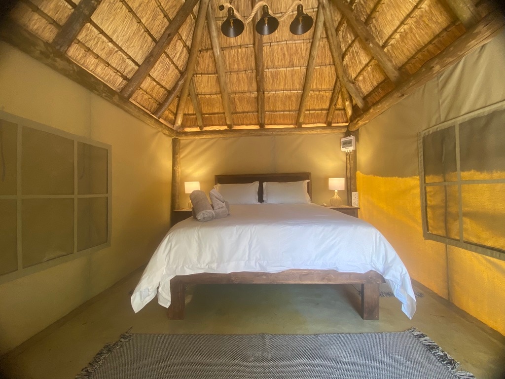 The luxury tent is in the heart of the Waterberg bushveld on Newburg farm at Elements Golf Reserve. Enjoy watching wildlife, including buffalo, sable, kudu and other plains game from the privacy of your patio. A unique luxury glamping experience, with all the comforts of home. The tent is fully equipped for self-catering with kitchenette and built-in braai. The tent sleeps 4 guests and is wheelchair friendly. TV and full DSTV. Situated approximately 200m from a private access gate to Elements.