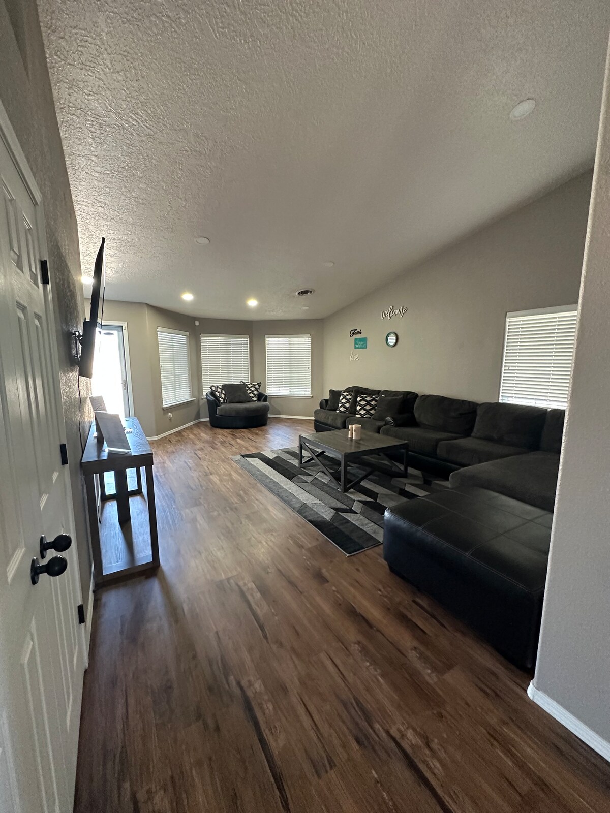 평온한 숙소에서 온 가족이 함께 휴식 시간을 가져보세요. 침실 4개 숙소. 방 3개에 침대가 있습니다. 마스터 침실에는 킹사이즈 침대가 있습니다. 한 방에는 퀸사이즈 침대가 있습니다. 침대가 있는 세 번째 방에는 풀사이즈 침대가 있습니다. 6명이 편안하게 잘 수 있습니다. 네 번째 방은 러닝머신이 있는 운동실입니다. 멋지고 아늑한 뒷마당. 대형 소파가 있는 멋진 거실. 와이파이가 제공됩니다. 거실에는 TV가 있고 방 3개에는 TV가 있습니다. 앞마당에 멋진 잉어 연못이 있습니다.