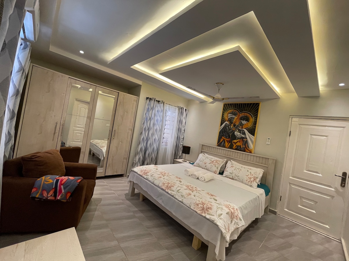 Welcome to your stylish home in Gbawe, Accra. This modern 2bed condo is perfect for guests seeking comfort, privacy, and convenience, just 20 minutes from Kotoka International Airport and close to Accra’s luxury beaches. Unwind in a peaceful, secure neighborhood featuring Fast WiFi, Netflix, a fully equipped kitchen, and spacious, tastefully furnished interiors. Ideal for couples, honeymooners, families, business travelers, and digital nomads, this home is designed for both short and long stays.
