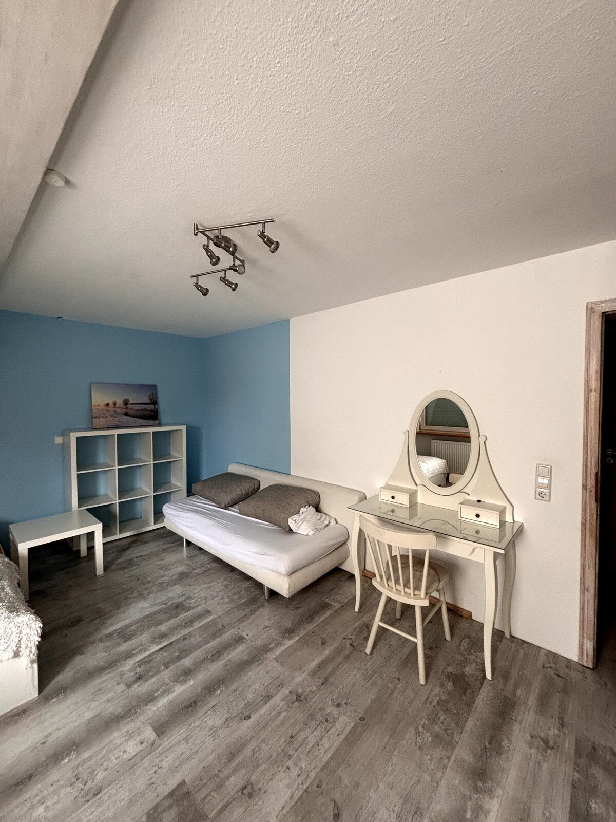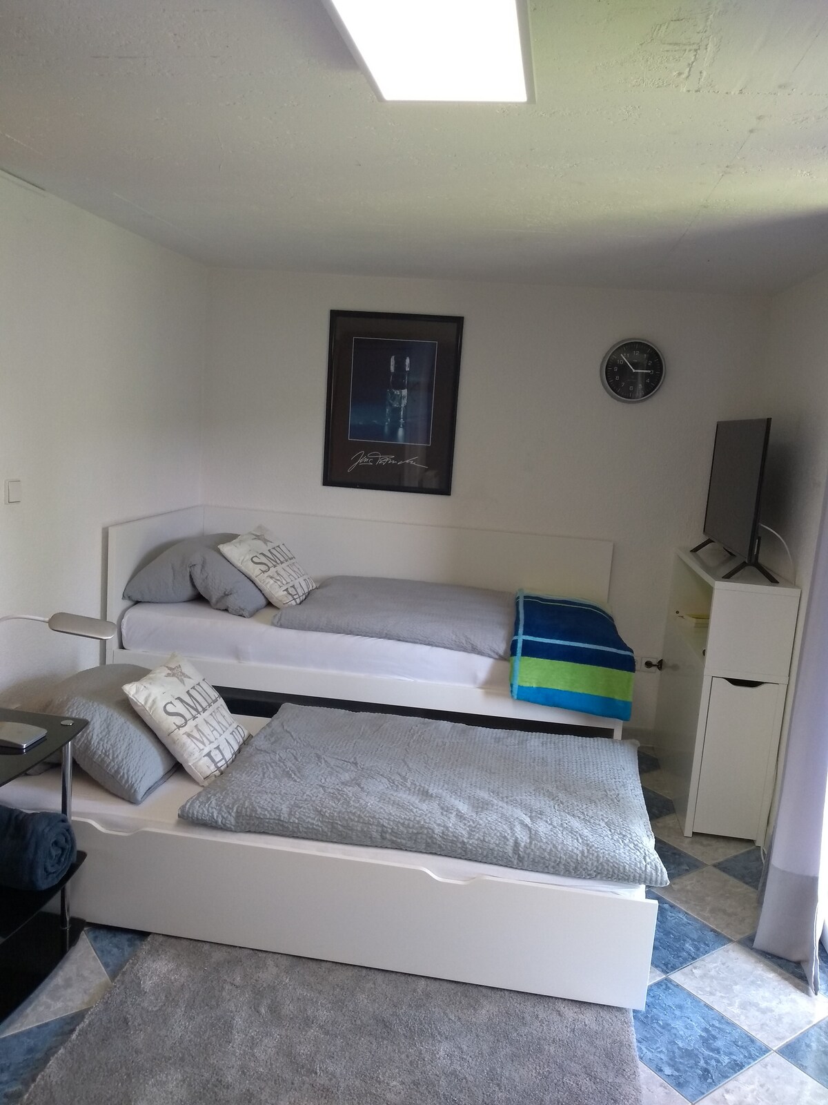 Unserer kleine 1-Zimmer-Wohnung ist modern und gemütlich eingerichtet. Im Schlaf-/Arbeitszimmer befindet sich neben Doppelbett und Schrank auch ein Arbeitsplatz mit Bürostuhl sowie ein Flatscreen-TV mit Sessel. Gerne könnt Ihr unser Gäste-WLan nutzen. Das kleine Badezimmer ist hochwertig ausgestattet und hat eine ebenerdige Regendusche. In der Küche findet Ihr alles für den täglichen Gebrauch (inkl. Spülmaschine, Herd, Ofen und Mikrowelle).