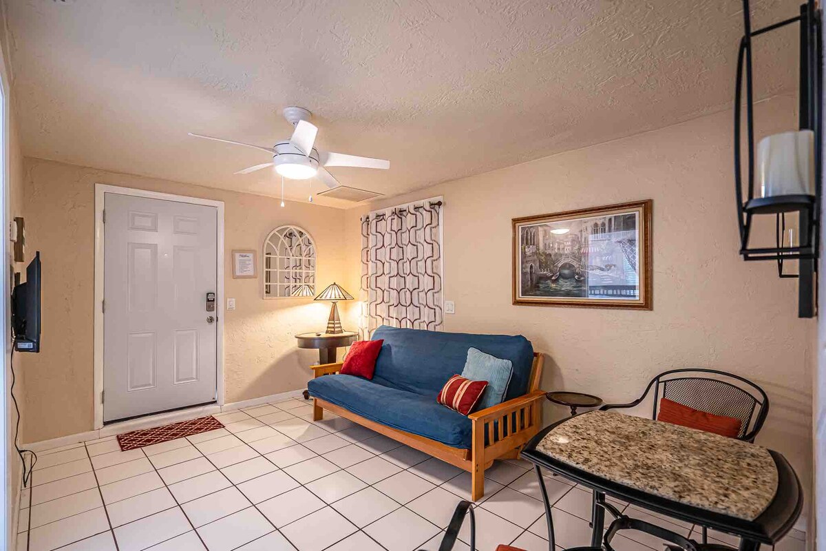 전용 출입구, 전용 통로, 전용 작은 욕실이 있는 작은 스위트로 대부분의 성인을 수용할 수 있지만 키가 큰 사람(6'5" 이상) 또는 비만인에게는 너무 작습니다. 모든 것이 갖춰져 있으며, 매우 아늑한 원룸 스튜디오로 마이크로 간이 주방, 미니 냉장고, 전자레인지, 비치 타월, 모래 의자, 작은 숄더 쿨러가 있습니다. 저희 숙소의 위치는 해변, 공항, 웨스트 팜 시내, 시티 플레이스, 클레마티스까지 4~6마일 거리에 있어 편리합니다. 우버 요금이 저렴합니다. PBI 공항에서 6마일 거리에 있습니다.
