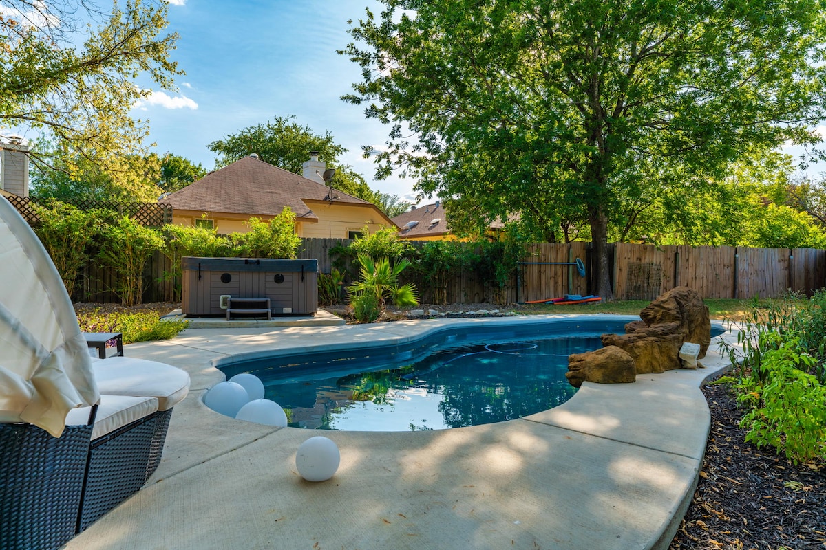아보레툼 지역에 위치한 이 독특한 숙소는 조용한 동네에 있으며 레스토랑, 식료품점 5개에서 몇 분 거리에 있으며 고속도로에 쉽게 접근할 수 있습니다. Q2, 더 도메인 & 르네상스 오스틴 호텔에서 가깝습니다. 무디 센터 콘서트를 보러 마을에 오시는 경우, 숙소는 15 ~ 20분 거리에 있습니다. 넓은 침실 4개(킹 1개, 퀸 2개, 싱글 1개)와 욕실 3개가 있습니다. 수영장과 온수 욕조는 연중 이용 가능하지만 수영장은 5월부터 10월까지 따뜻합니다. 휴식을 취하기에 좋은 곳입니다.