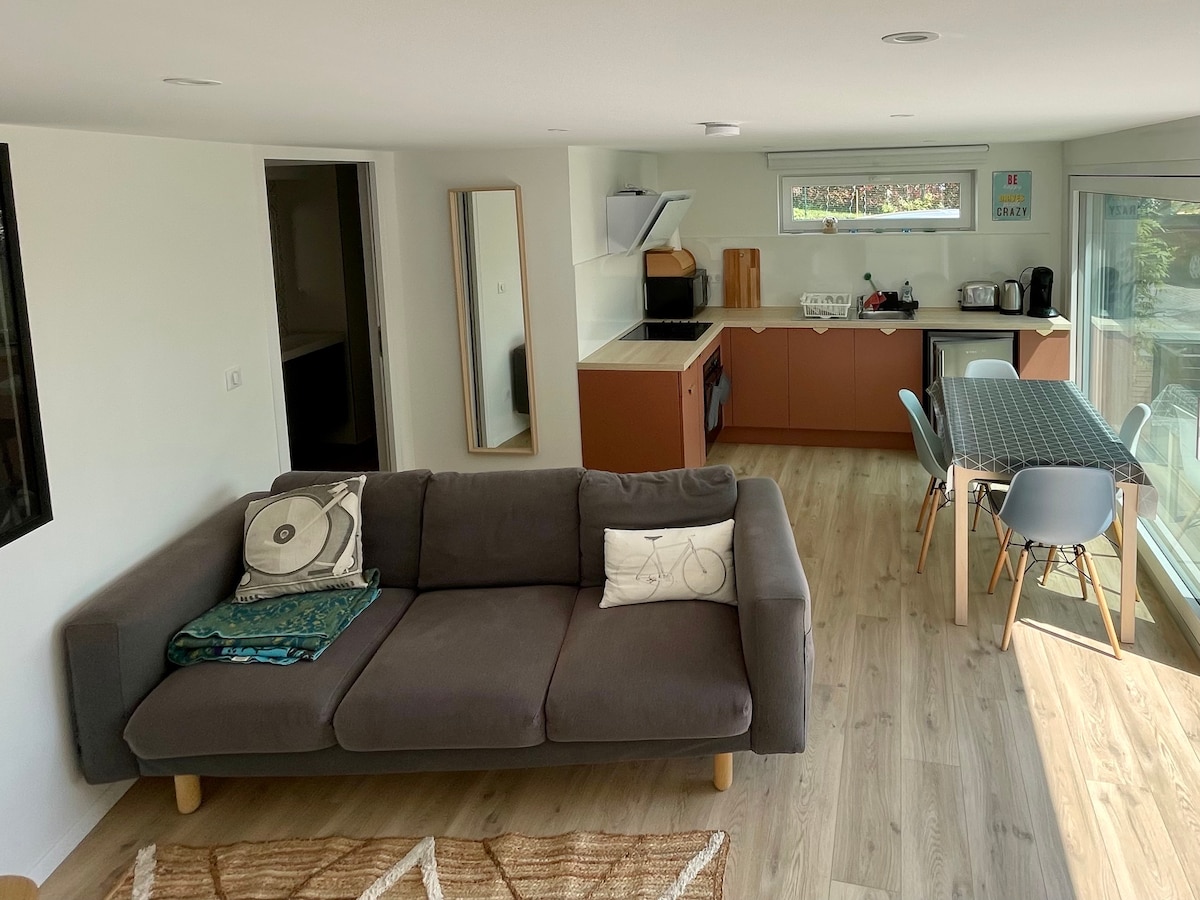 Enjoy and relax in this calm modern space, 10 minutes away from downtown Basel. The apartment, renovated in an industrial style, functional and with warm atmosphere, offers: * Comfortable studio minimalist, on the ground floor of our private house * Private entrance with private parking and easy access * A calm terrace, south facing, in a quiet environment * Ideal for up to 2 adults Location: * Very close to Swiss border - Swiss public transport 10 min walk * Euroairport - 10 min by car