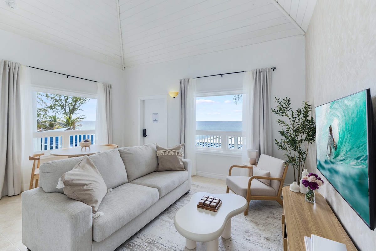 Relax in an Ocean View Deluxe Room featuring a plush king bed, walk-in shower, mini fridge, Nespresso Vertuo machine, and smart TV. Step onto a shared balcony with stunning Caribbean views and direct access to the pool deck and Nova Bar & Restaurant. Perfect for couples or solo travelers seeking a stylish, comfortable stay by the sea.