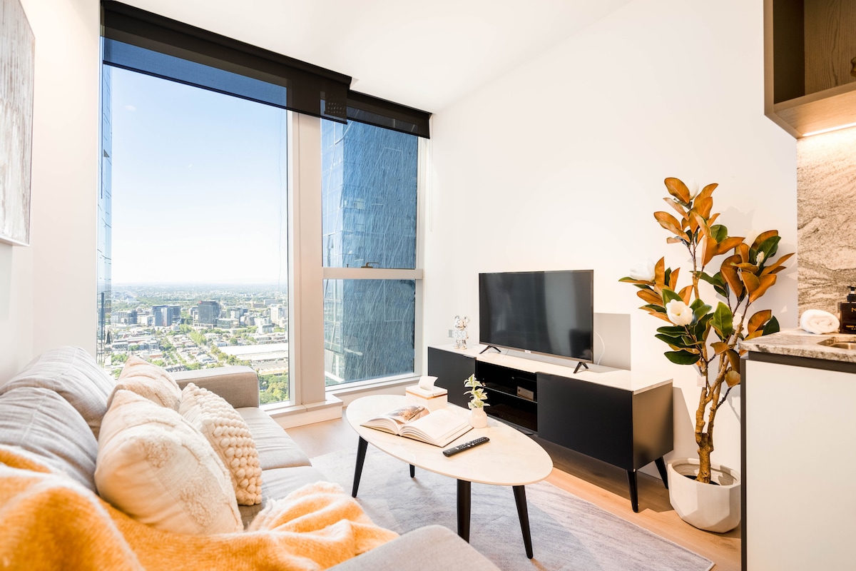 Luxury high-floor 3-bedroom apartment with stunning Melbourne skyline views through floor-to-ceiling windows. Perfect for families, groups, or business travellers seeking a stylish and comfortable city stay. Located next to Spencer Street Outlet and just minutes from the CBD, Southern Cross Station, and Bourke Street Mall. Enjoy modern interiors, spacious living areas, and access to building amenities including a pool, gym, sauna, and steam room.