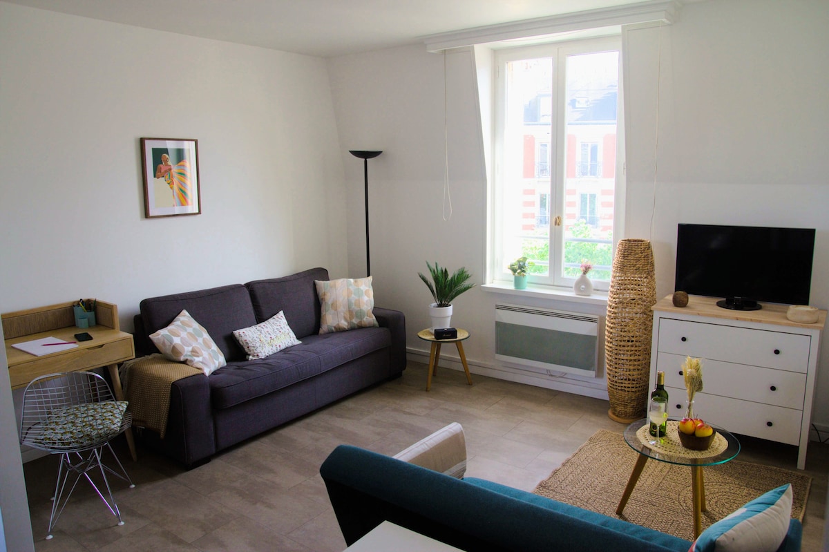 Spacieux studio indépendant avec coin chambre séparé et canapé lit dans l'espace salon, pouvant accueillir 4 personnes, grande hauteur sous plafond. Le logement est très bien situé, à proximité des transports en commun (bus, train, métro, tramway), à moins de 30 minutes des Champs Elysées. Commerces à 2 pas (marchés les mercredis et samedis matin) Possibilité de garer des vélos en toute sécurité. Nous habitons à proximité du logement et ferons notre possible pour rendre votre séjour agréable.