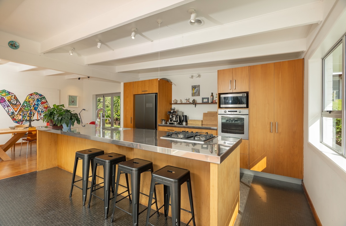 Seaside beach house in Parua Bay with stunning views and a short walk to the jetty and local tavern. Suitable for 8 guests, it's an iconic 60โs style with a Mediterranean touch. The house has a large, sunlit terrace and open-plan living area, for a relaxing, indoor-outdoor flow. For entertainment, there's a lawn, trampoline, and downstairs rumpus room with TV, pool table, bunkroom, and bathroom. Stylishly furnished, it includes colourful art and period design, solar energy and Tesla charger.