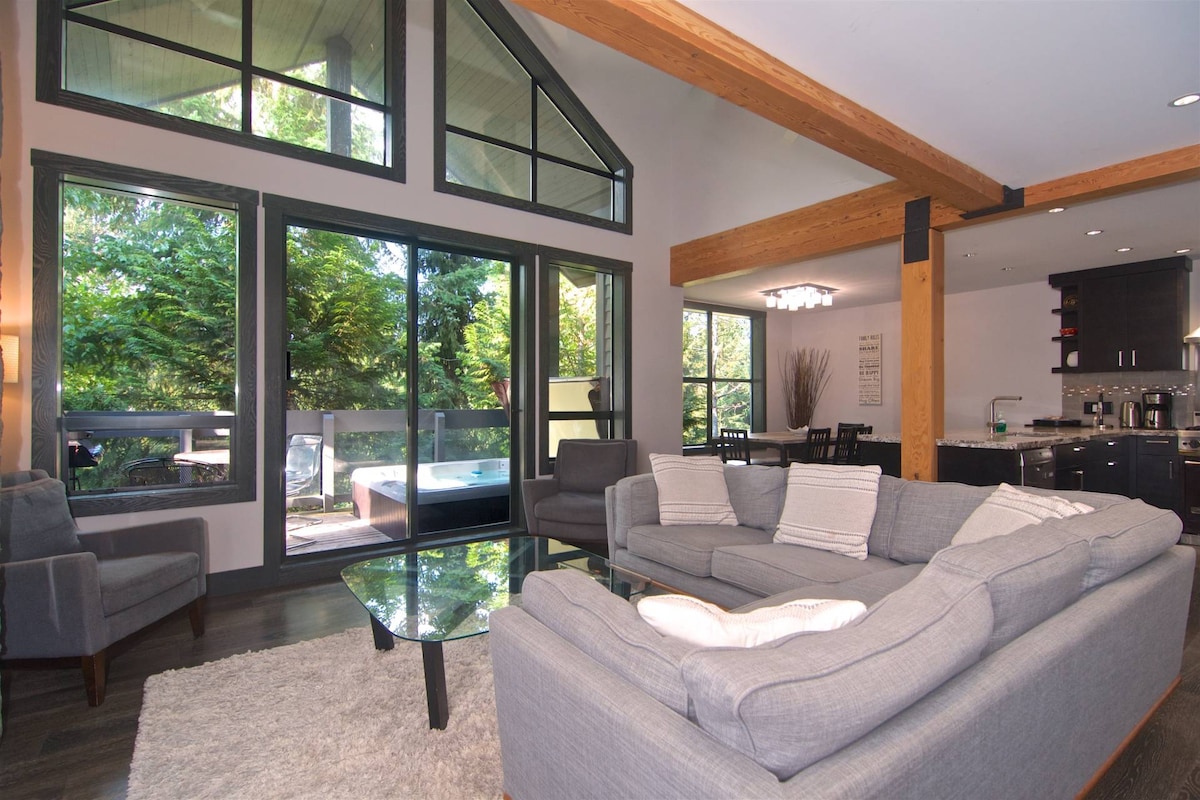 Welcome! This spectacular 2,655 Sq Ft 4BR/3.5BA private Whistler Chalet comfortably sleeps 9 guests and features a fully equipped chefs kitchen, a massive private hot tub, inside and outside dining areas, BBQ, steam shower, W/D, A/C, large mudroom and a private 2 car garage for all your bikes and gear. Located in Whistler Village North and a 2 min walk to Nesters. Enjoy your private chalet with tree views and serenity away from the village noise while being just minutes from all the action!