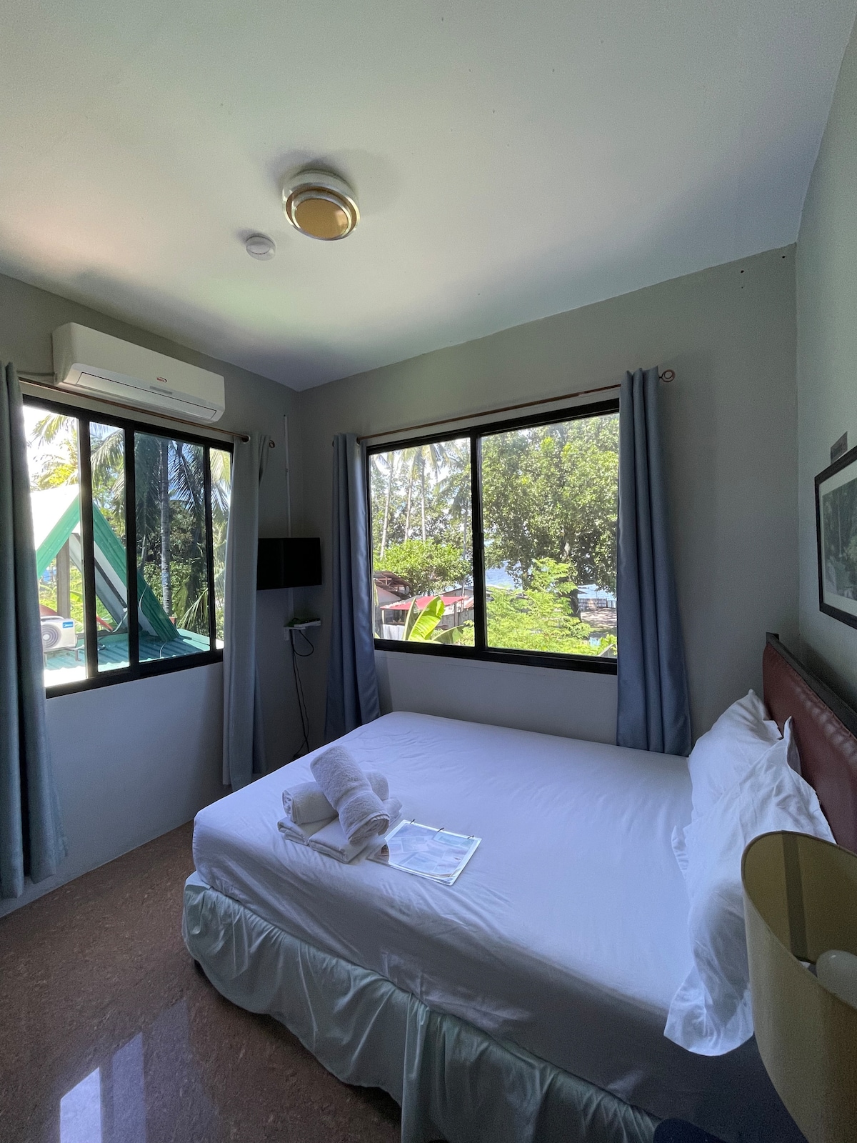 Our house offers amazing views of the sea, and you can swim, kayak or snorkel without leaving the property. We have 2 bedrooms upstairs with new aircon units and 1 downstairs with ceiling fan. Upstairs bedrooms have queen beds and downstairs a king with thick mattresses and nice linens. The master bedroom overlooks the sea. A wraparound terrace provides great views at sunset. Our parents have a cottage next door and can help at all times. Wifi is fast so you can work from home. Relax and enjoy!