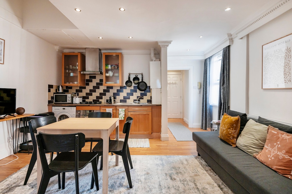 Elegant 1-bedroom Chelsea apartment with oak floors, calming interiors, full kitchen, and access to a quiet communal garden. Just 2 minutes from King’s Road and a short walk to Saatchi Gallery, museums, and Chelsea Physic Garden. Peaceful and stylish with secondary glazing to bedroom and lounge for a peaceful stay Superfast Wi-Fi, Smart TV and great transport links via South Kensington & Sloane Square stations Please remove shoes indoors A perfect London base for couples or solo travellers.
