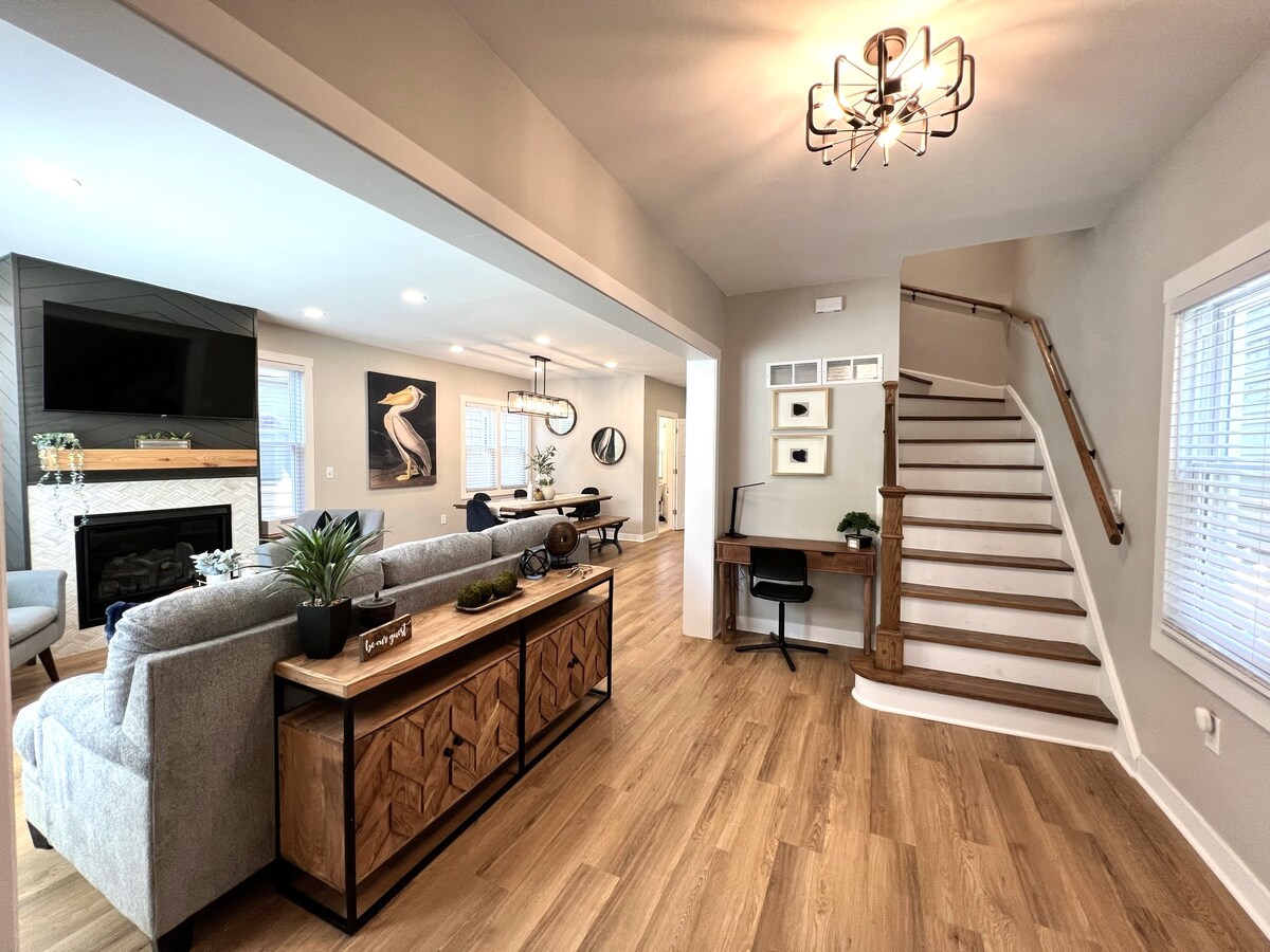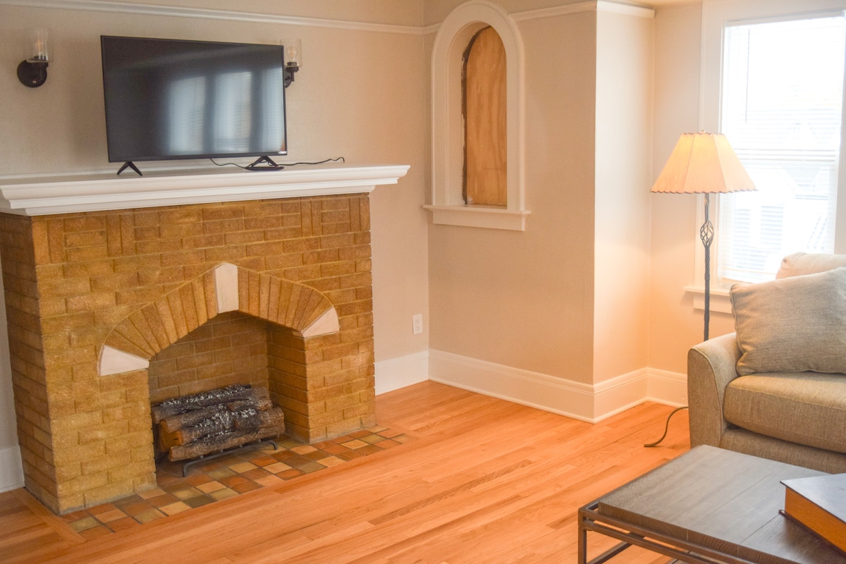 1924 크래프츠먼 방갈로에 오신 것을 환영합니다! 프레리 하우스 스타일과 시카고 크래프트맨의 혁신을 결합한 벽돌 방갈로가 여러분의 숙박을 기다리고 있습니다. 전용 출입구, 침실 2개, 주방, 욕실이 있는 위층 스위트를 즐기실 수 있습니다. 새롭게 단장한 도자기 대리석 바닥은 한 걸음 한 걸음 고급스러움을 불러일으키며, 새로운 'Article' 조립식 소파, 스트리밍이 가능한 50인치 TV, 100% 면 침구와 수건, 혜택과 가전제품이 가득한 주방, 공기를 깨끗하게 유지하는 풍부한 녹지를 갖추고 있습니다.