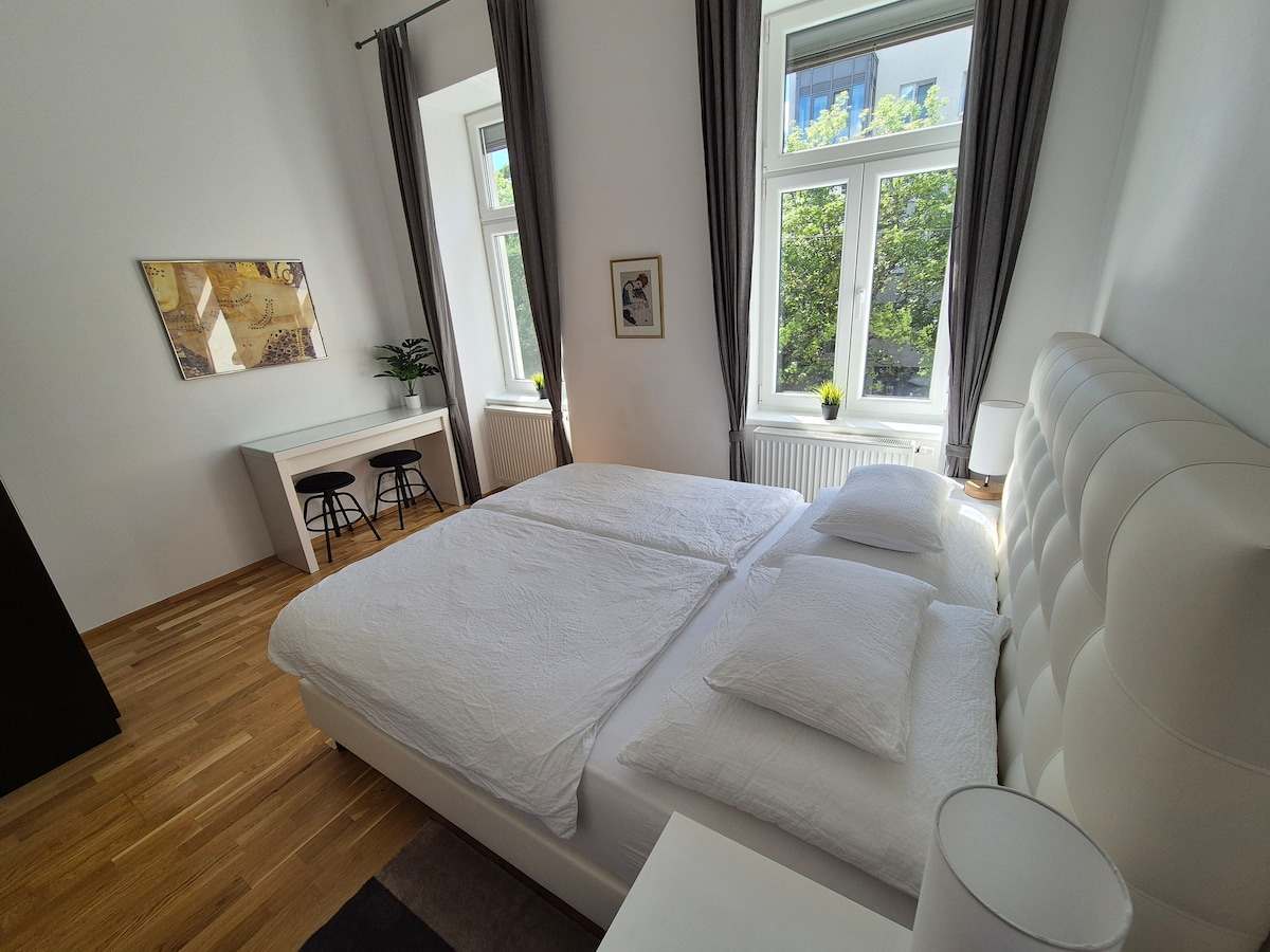This splendid, ultra luxury 58 sqm two bedroom apartment in a belle époque building is located directly next to the city center of Vienna, the 1st district. The apartment offers a living room with dining area and fully equipped kitchen, 2 bedrooms, 1 bathroom and a separate toilet and has AC.