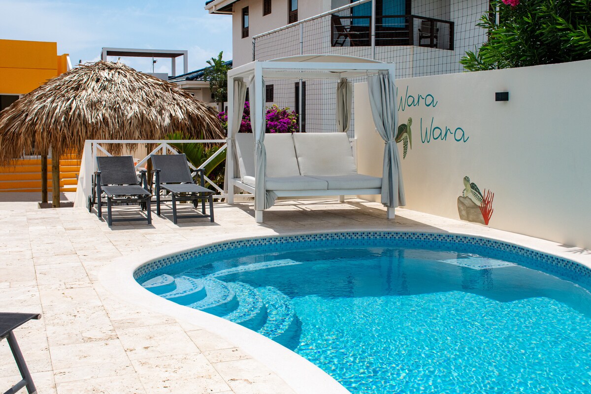 에어컨, 와이파이, 망고 나무가 있는 테라스를 갖춘 리노베이션된 깨끗한 스튜디오에서 퀴라소를 만나보세요. 요리? 식료품점은 활기찬 거리 건너편에 있습니다. 그림 같은 피터마이 (Pietermaai) 에서 식사와 살사 댄스를 즐겨보세요. 스트랜드 맘보 (Strand Mambo), 콘티키 (Contiki-), 카바나비치 (Cabanabeach). 그 사이에 스튜디오가 있습니다. - 공항 이동 가능 (추가) - 문 앞에 버스 정류장. -거리에서 피시바 푸드트럭이 있는 현지 해변, 직접 만든 분홍색 라임 음료 저는 여러분의 질문과 인사이더 팁을 위해 스튜디오 옆에 살고 있습니다.